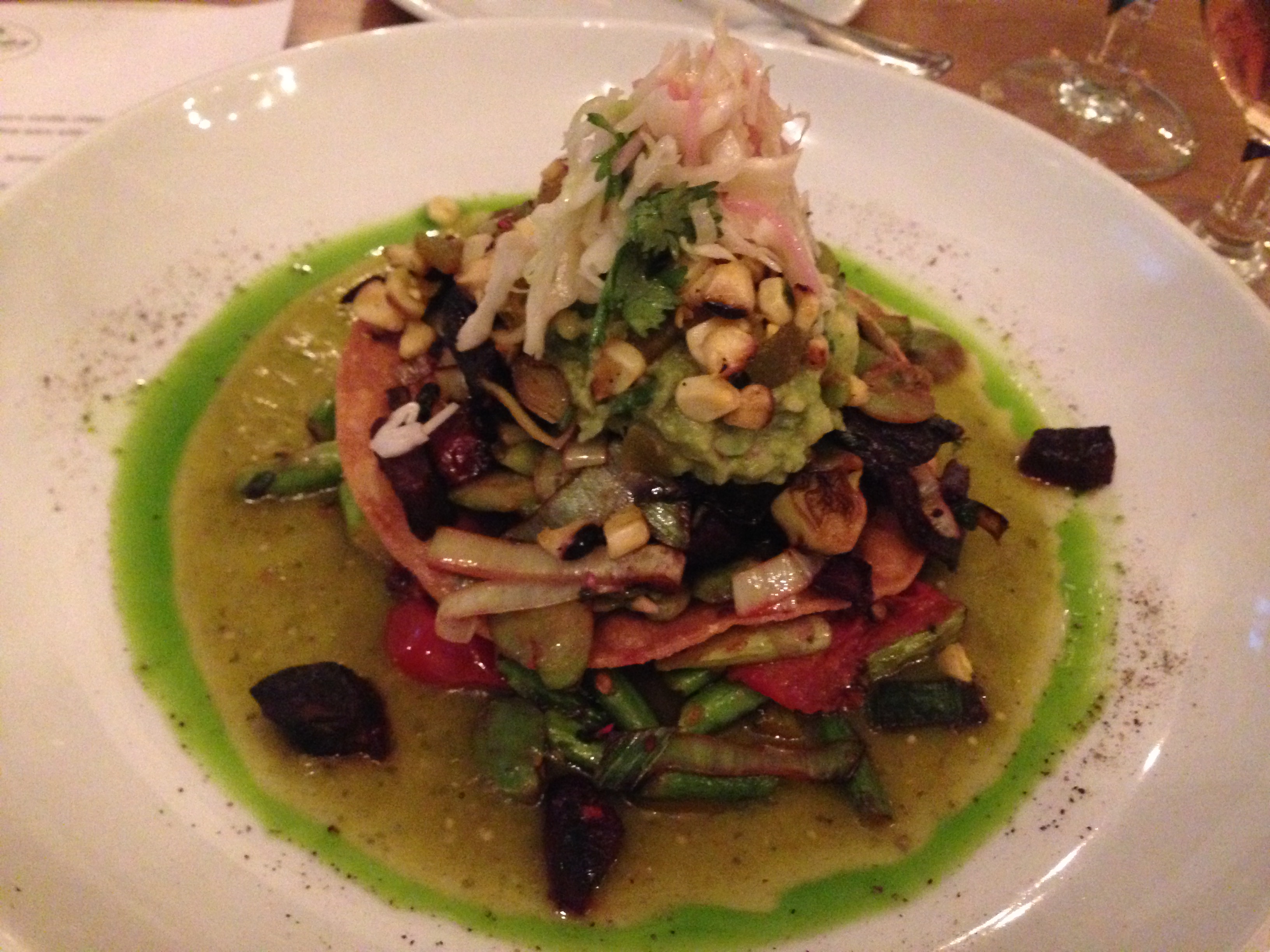On another visit, the chef made an equally delicious entrée – asparagus, fava beans, corn, and onions in a light tomato sauce topped with a crispy tortilla that was covered in roasted vegetables and topped with fresh guacamole and greens. Spectacular presentation and totally delicious.