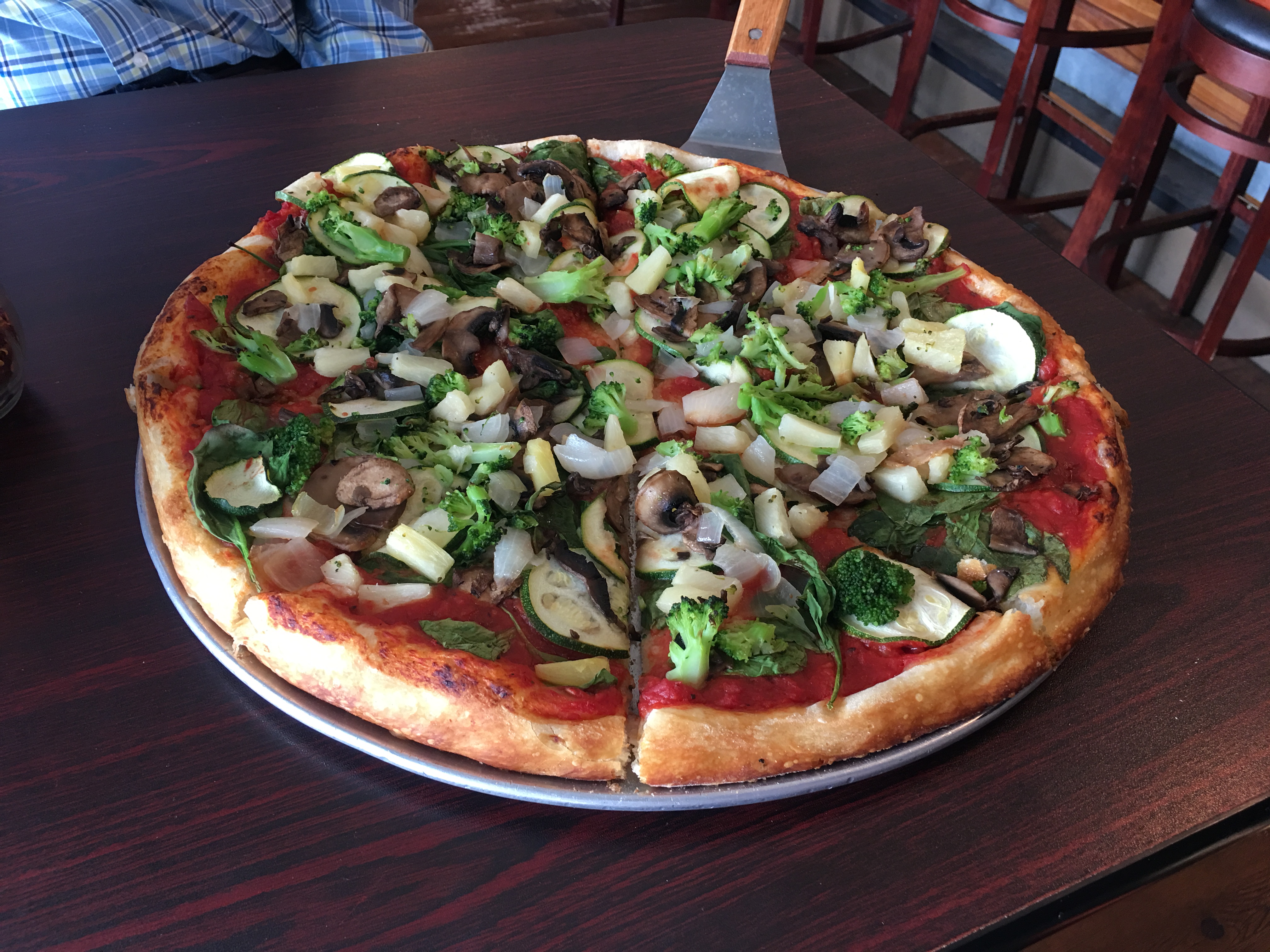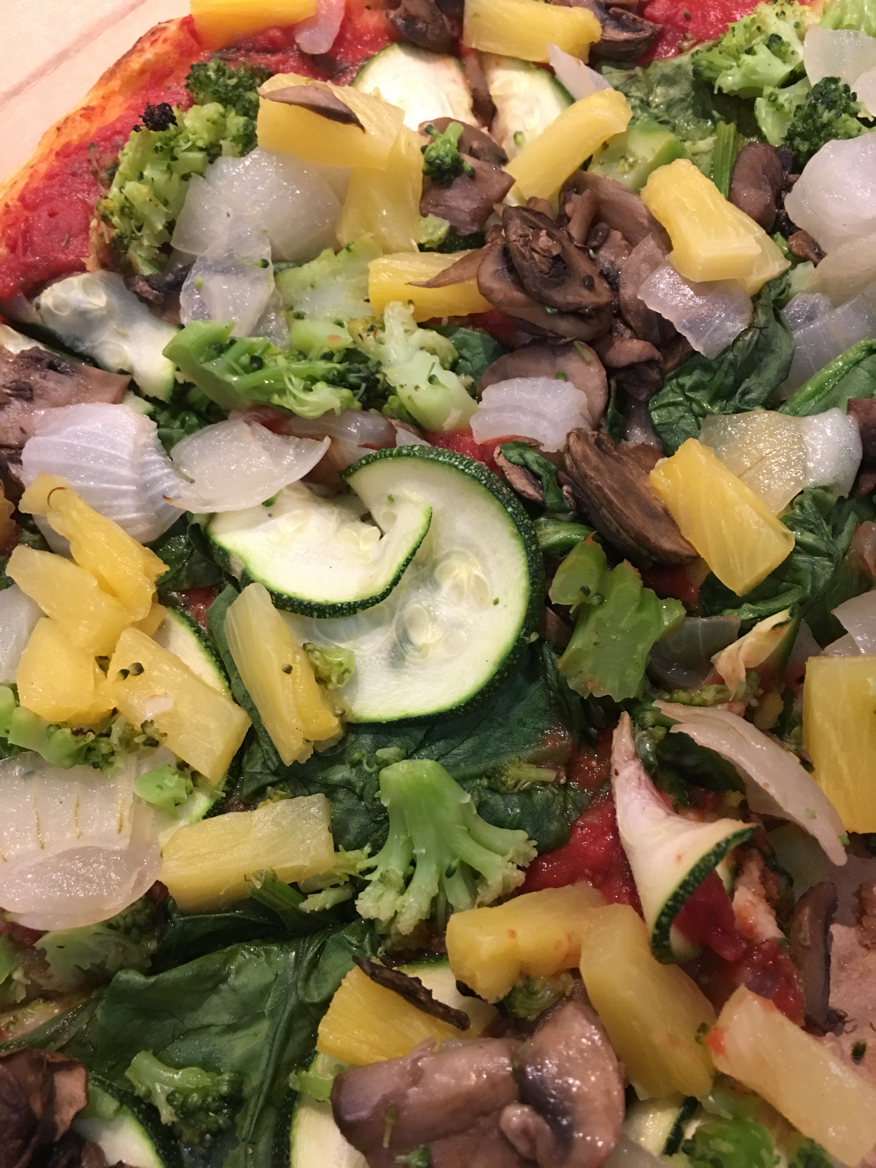 My typical 14-inch pizza has fresh broccoli florets, fresh spinach leaves, freshly mandolin-sliced zucchini, mushrooms, onions, and pineapple but there are also olives, peppers, tomatoes, basil, sun dried tomatoes, artichoke hearts and fresh garlic that can be added.
