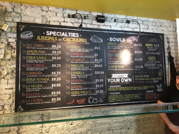 There are dozens of ways to enjoy an arepa (as illustrated below in their menu sign) but my favorite is the first option listed on the menu: the Del Campo: a warm homemade arepa filled with steaming hot black beans, sweet cooked plantains, sliced avocado, and tomatoes.