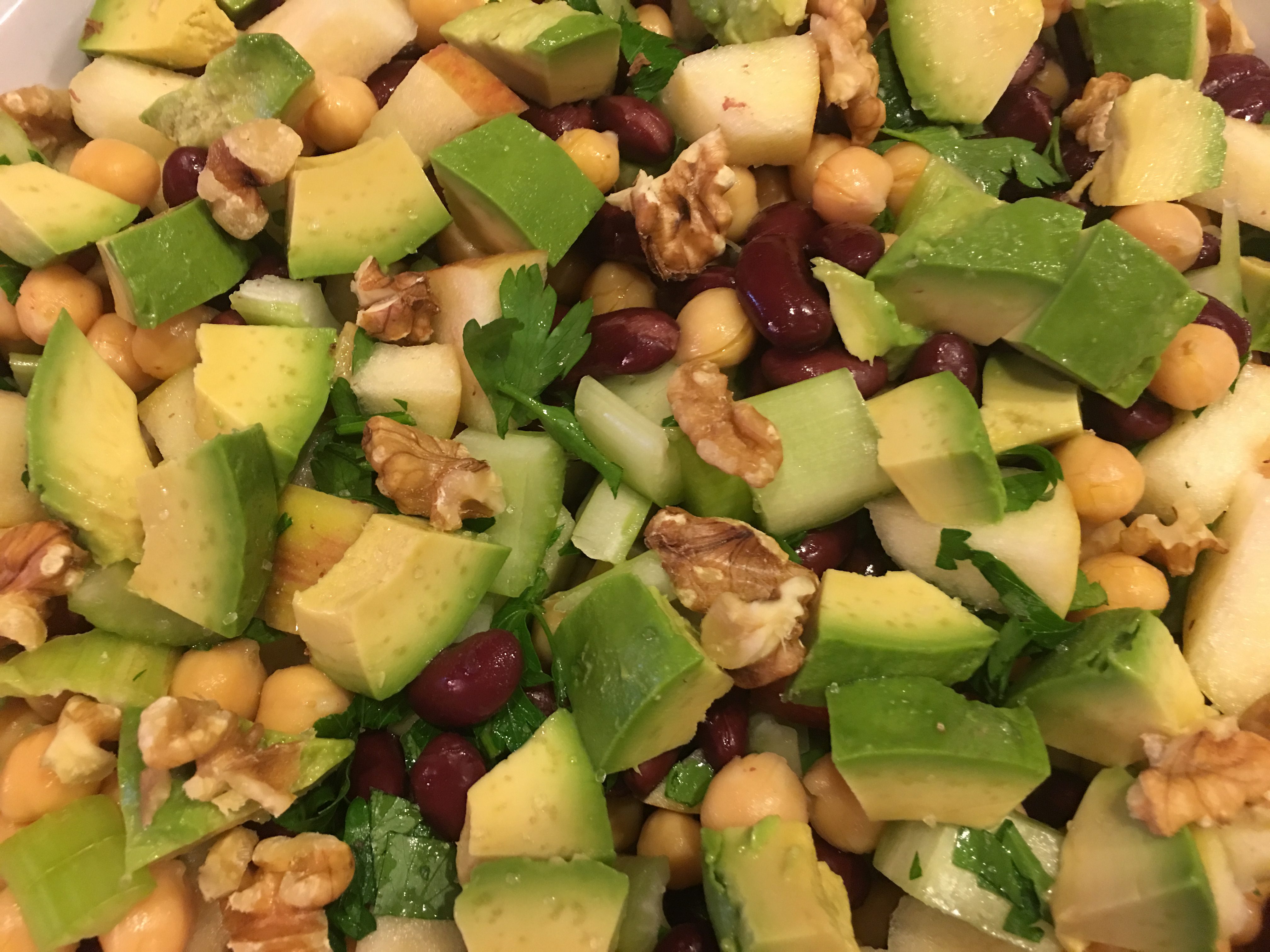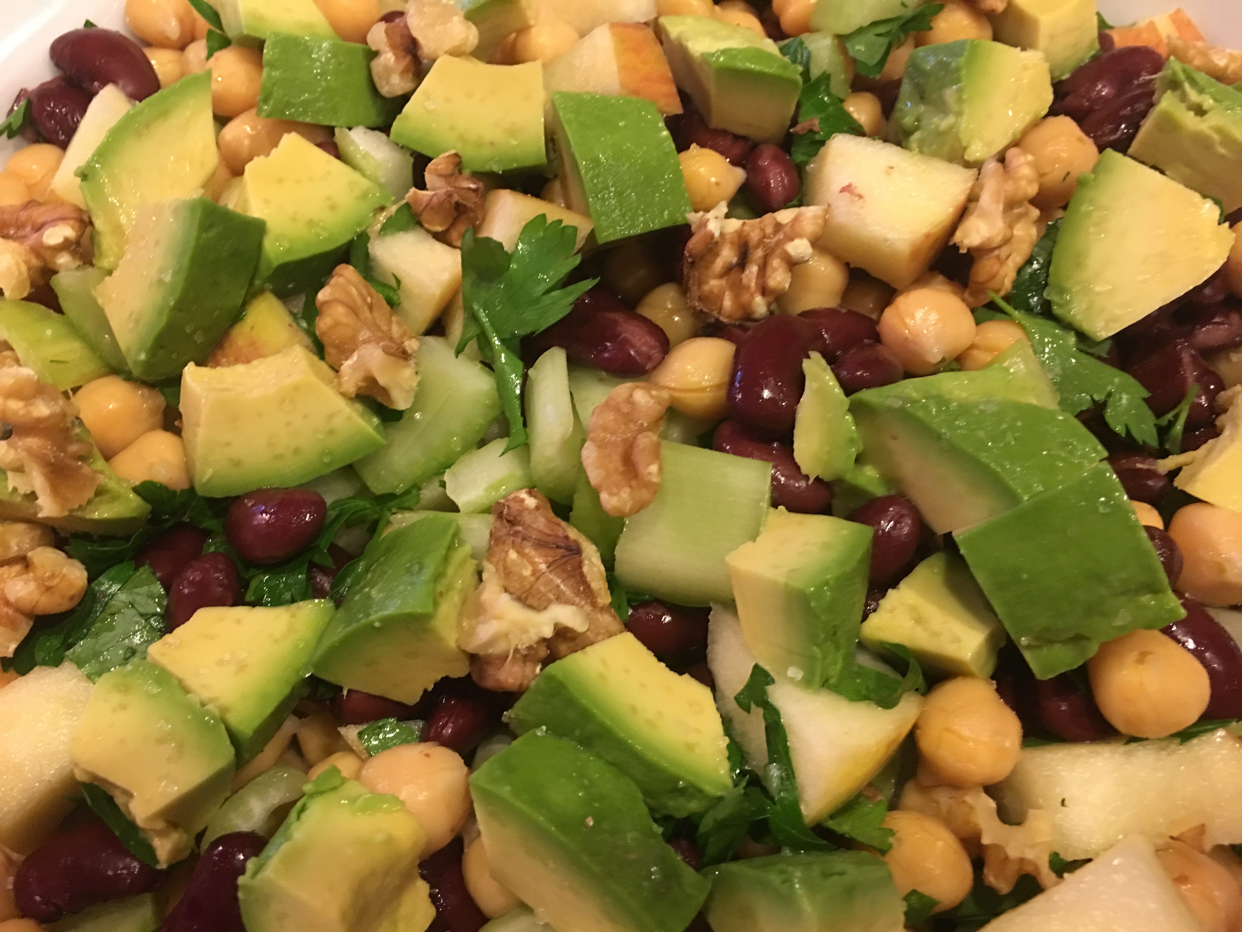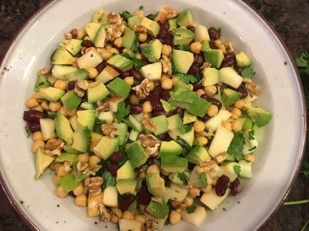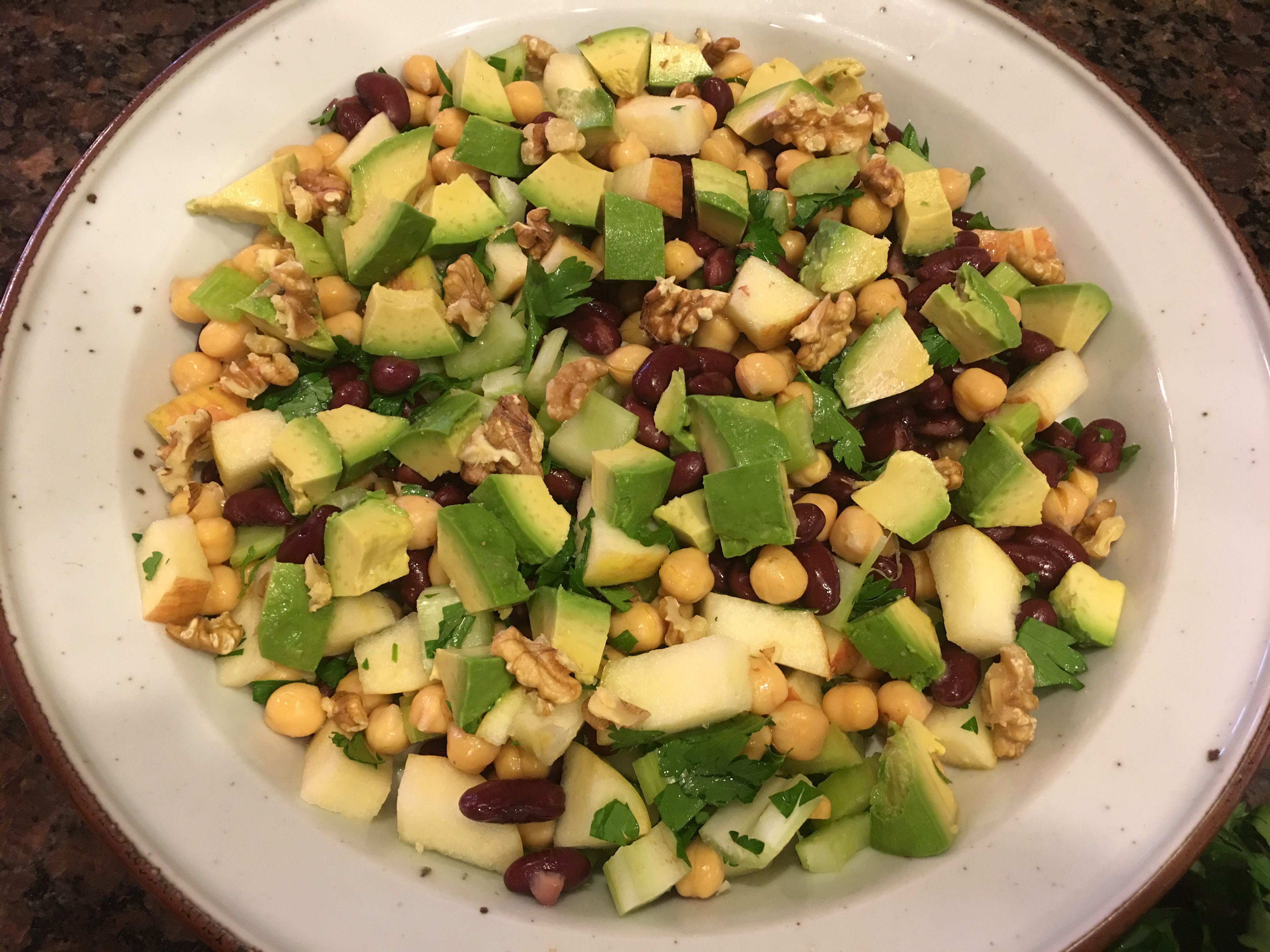 Beans are one of the foods I try to eat every single day and to ensure I do, I often make a bean salad. Although the recipe below is my go-to favorite, I often change the types of beans or seasoning depending on what I have on hand. The one ingredient always included is a crisp apple because the sweetness and crunchy texture go so well with beans that have a soft texture and mild flavor. But, it’s the avocado and walnuts that really make this salad special. Try the recipe and then be creative and mix it up based on what you have in the refrigerator and pantry.