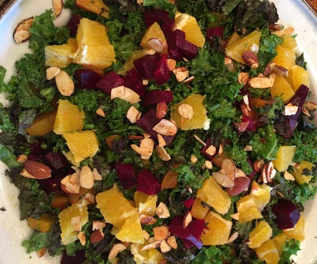 Kale Pesto Citrus Salad made with kale, pesto, and a navel orange is not your typical kale salad, but the combination of these three alpha ingredients makes for a truly delicious salad that is also nutritious and colorful. The other ingredients – beets and sliced almonds – are not as bold but add significant flavor and texture to a perfect Autumn salad.