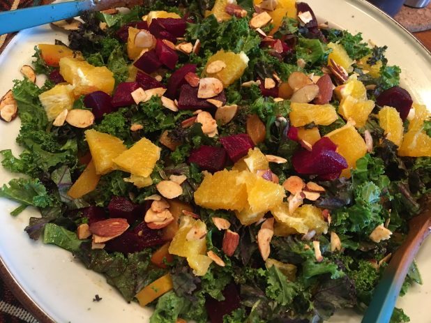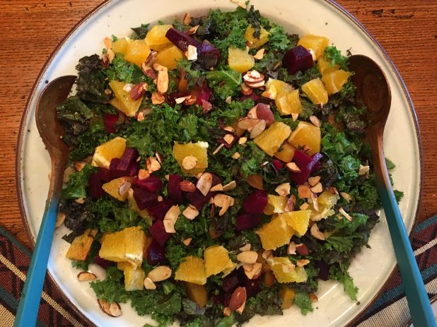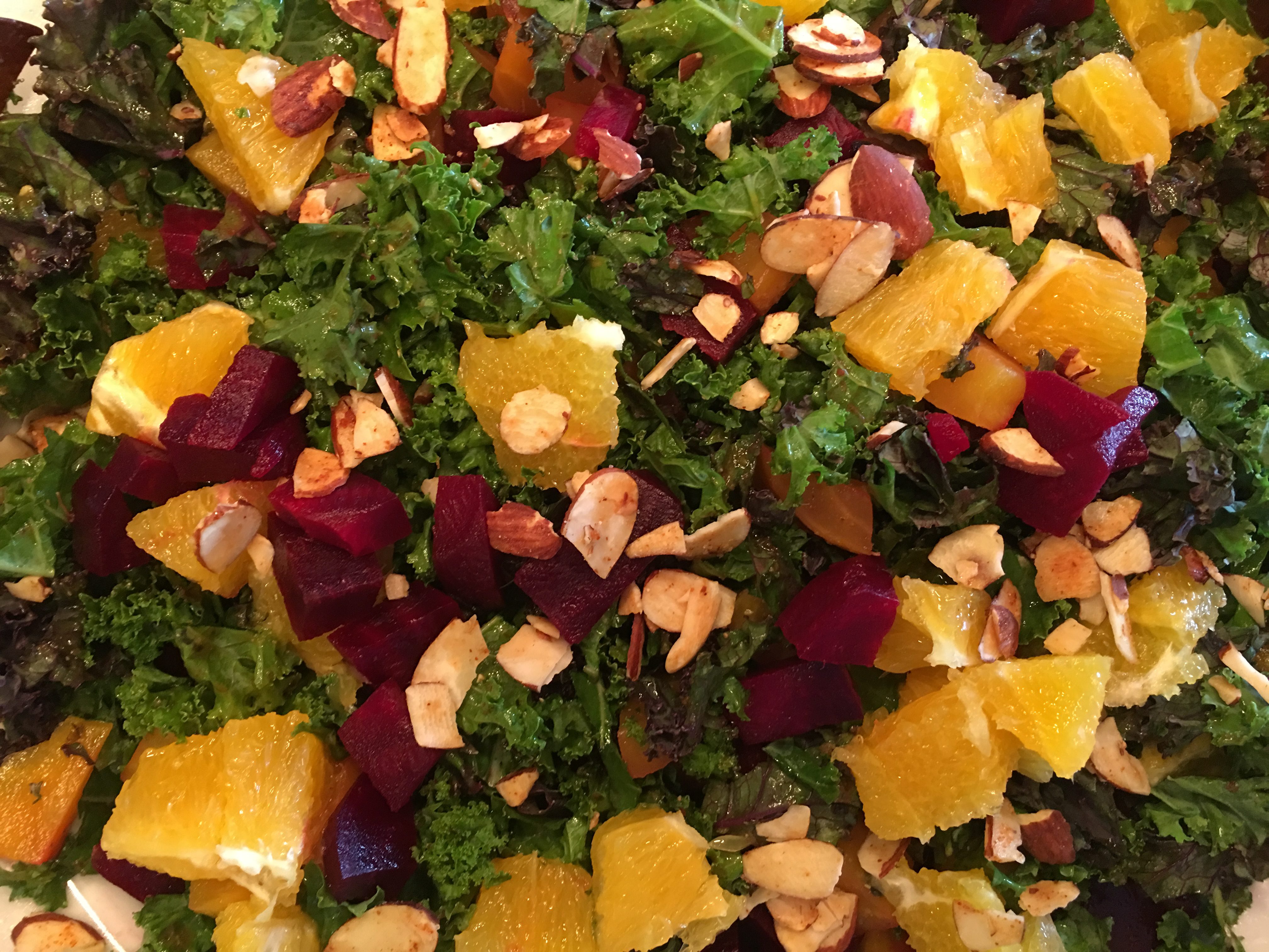 Remove the salad bowl from the refrigerator and drizzle the pesto dressing over the kale. Toss well. Sprinkle the beets and orange pieces over the salad. Toss. Sprinkle the almonds over the salad and serve.