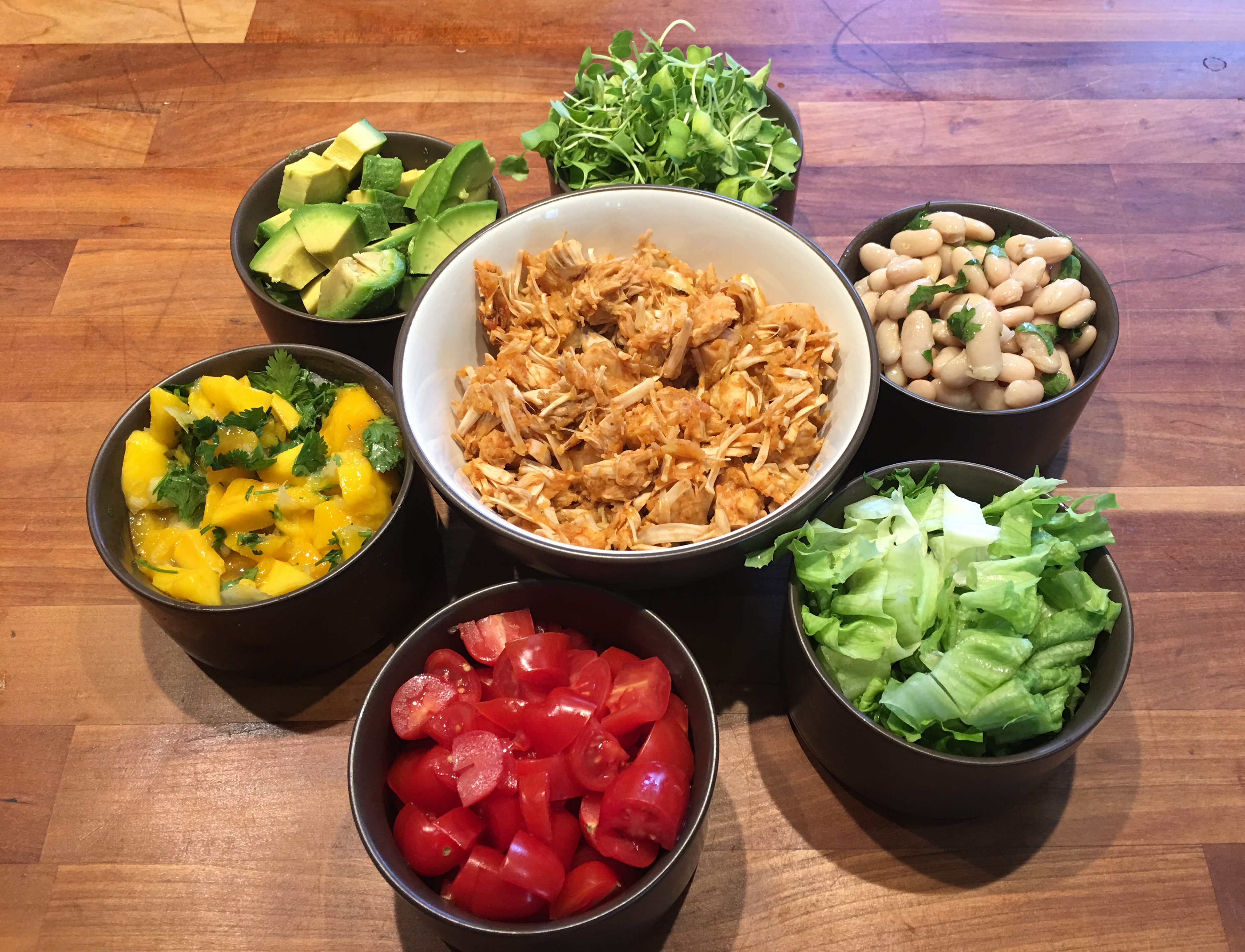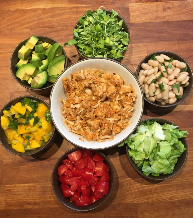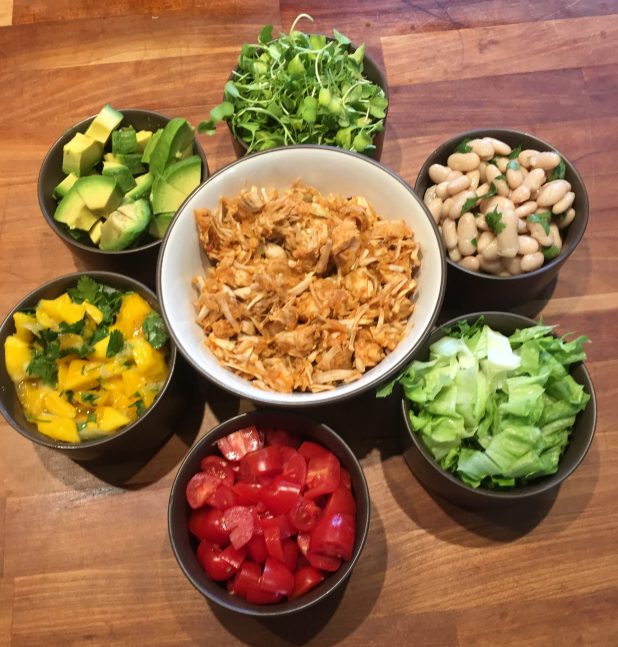 Pile the jackfruit followed by the beans, mango salsa, lettuce and/or sprouts, avocado and tomato.