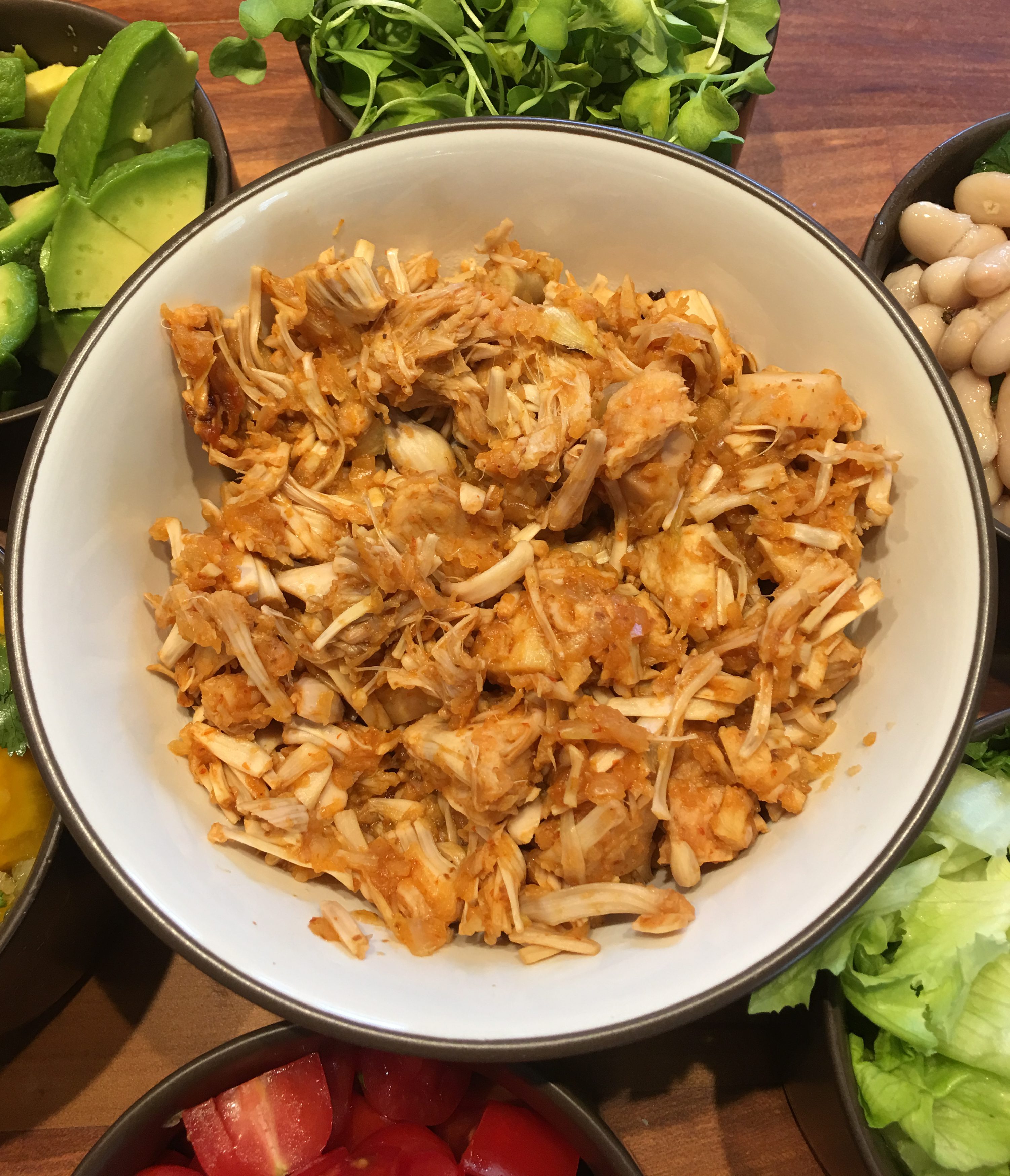Arrange the six small serving bowls around the medium-sized bowl holding the cooked jackfruit.