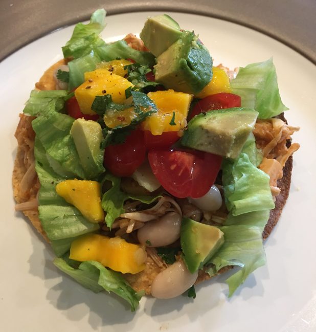 Tostados (and tacos) appeal to lots of people because there are a wide variety of toppings. In this easy to make recipe, caramelized jackfruit – a fantastic meat substitute – is the star of the show. Piled onto a warm crunchy corn tostado, jackfruit can the topped with seasoned white cannellini beans, some tangy mango salsa along with lettuce (or sprouts), avocado and tomatoes.