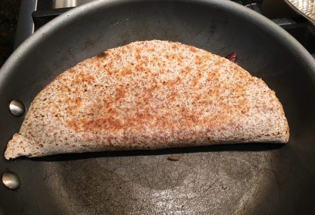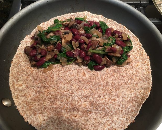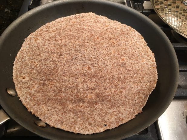Place a large non-stick pan or griddle on medium heat on the stove. Spray the griddle lightly with grapeseed or canola oil. Place the large tortilla in the pan.