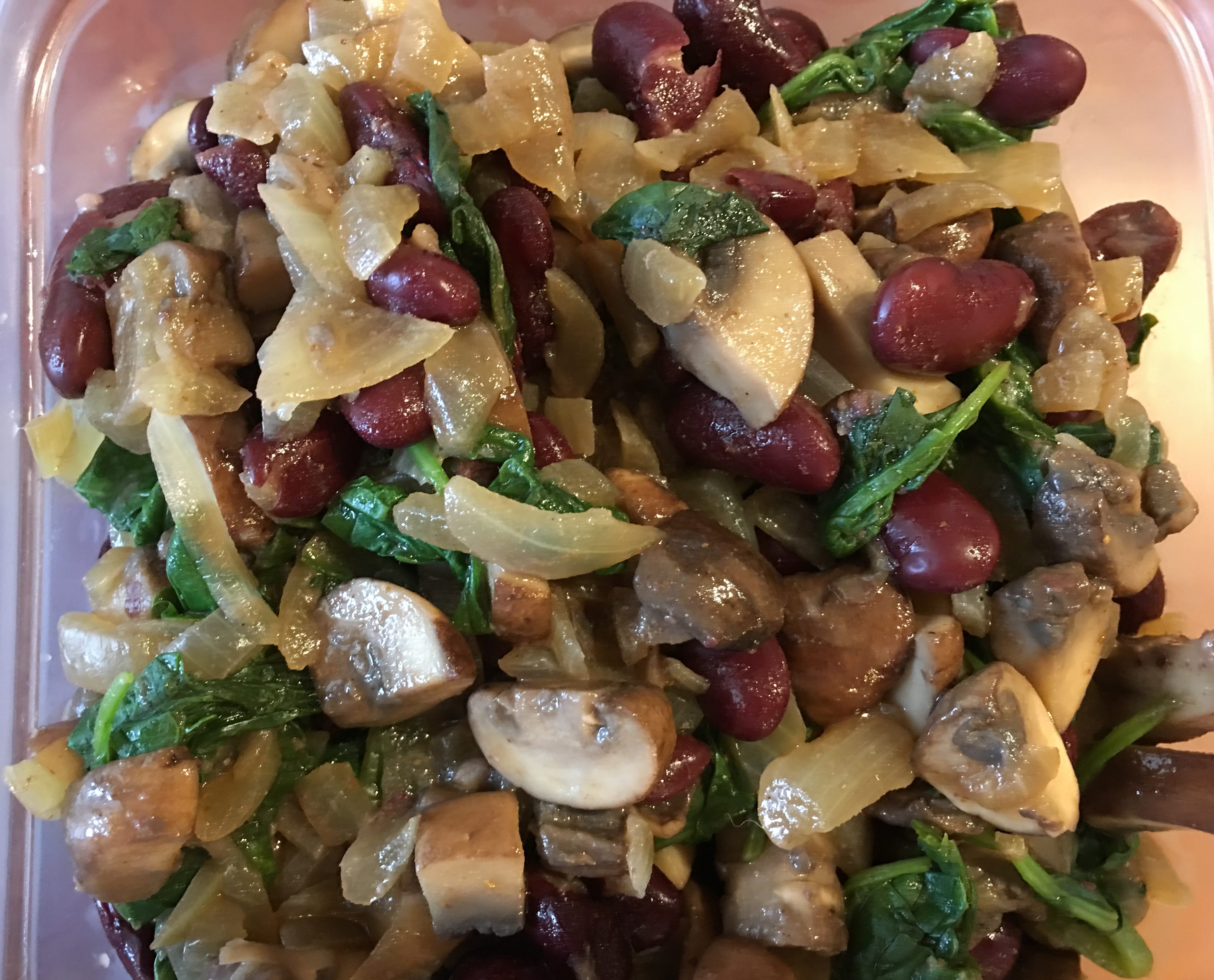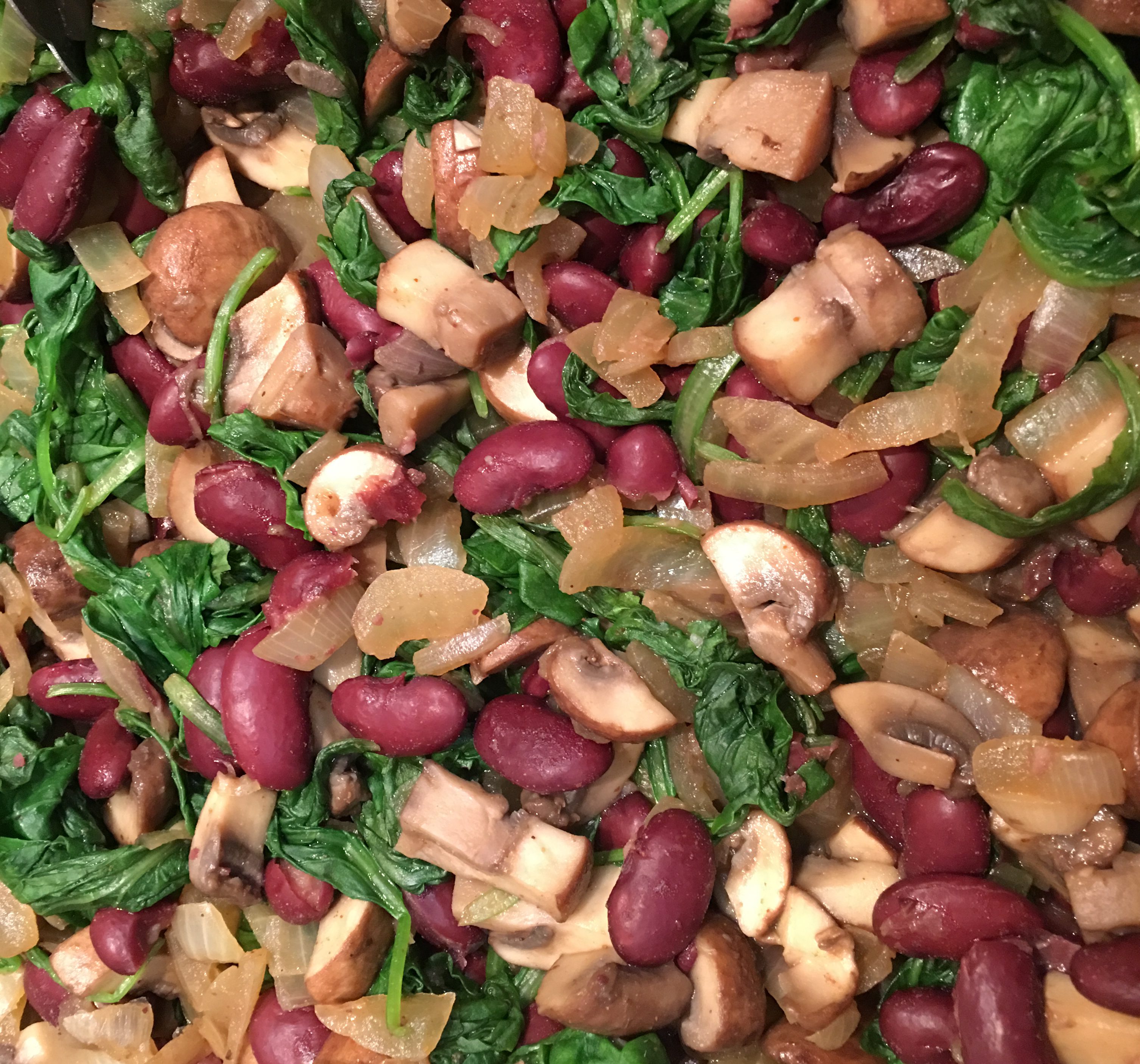 Add the kidney beans, chili powder, and nutritional yeast. Stir to blend. Reduce the heat to medium and add the kale. Cover the pot for 1 minute and then stir (tongs work great) to blend the wilted greens into the onion, bean and mushroom mixture. Cover and let cook for 1 minute. Remove the lid and turn the heat off. Blend the mixture and set aside.