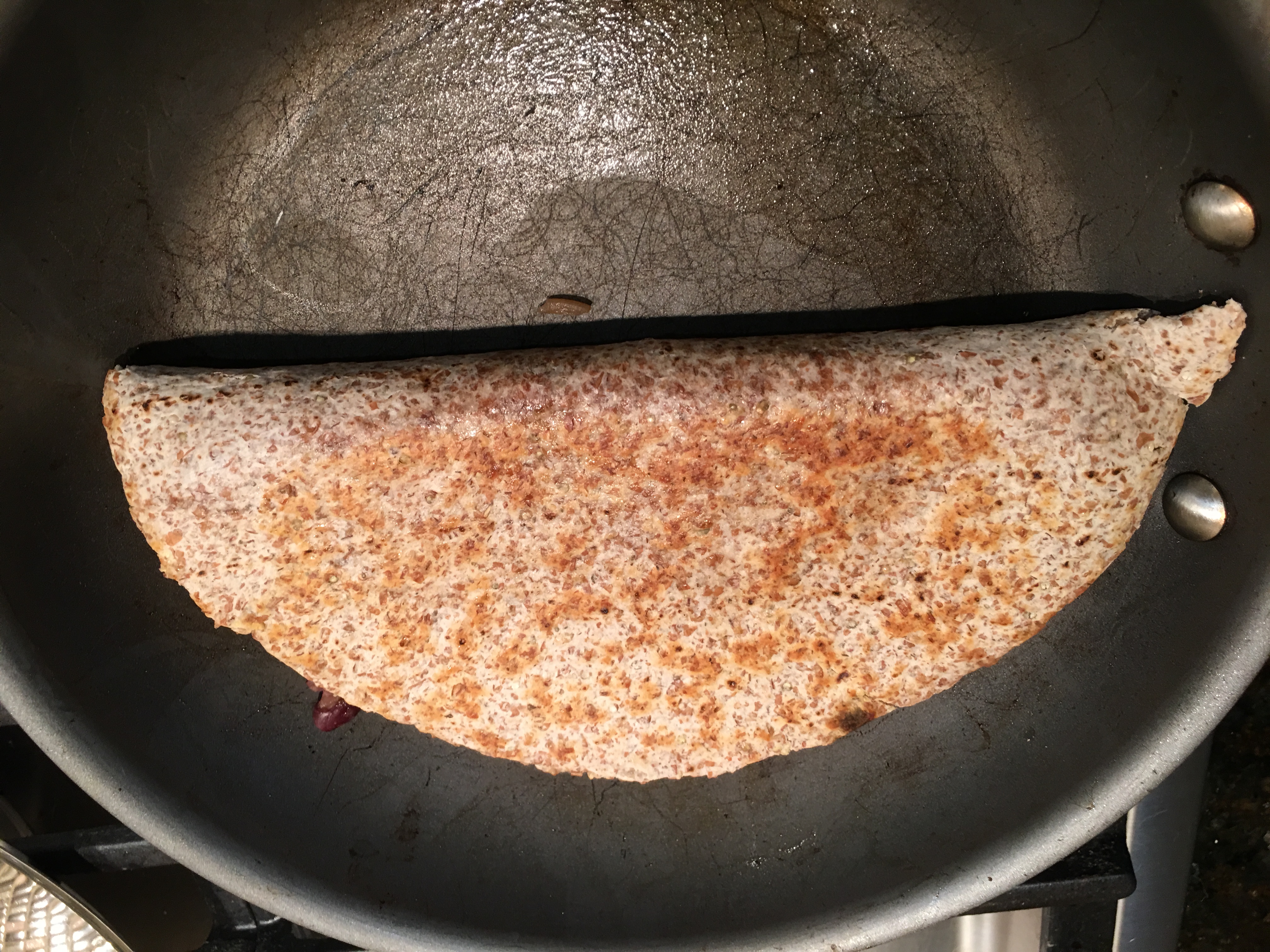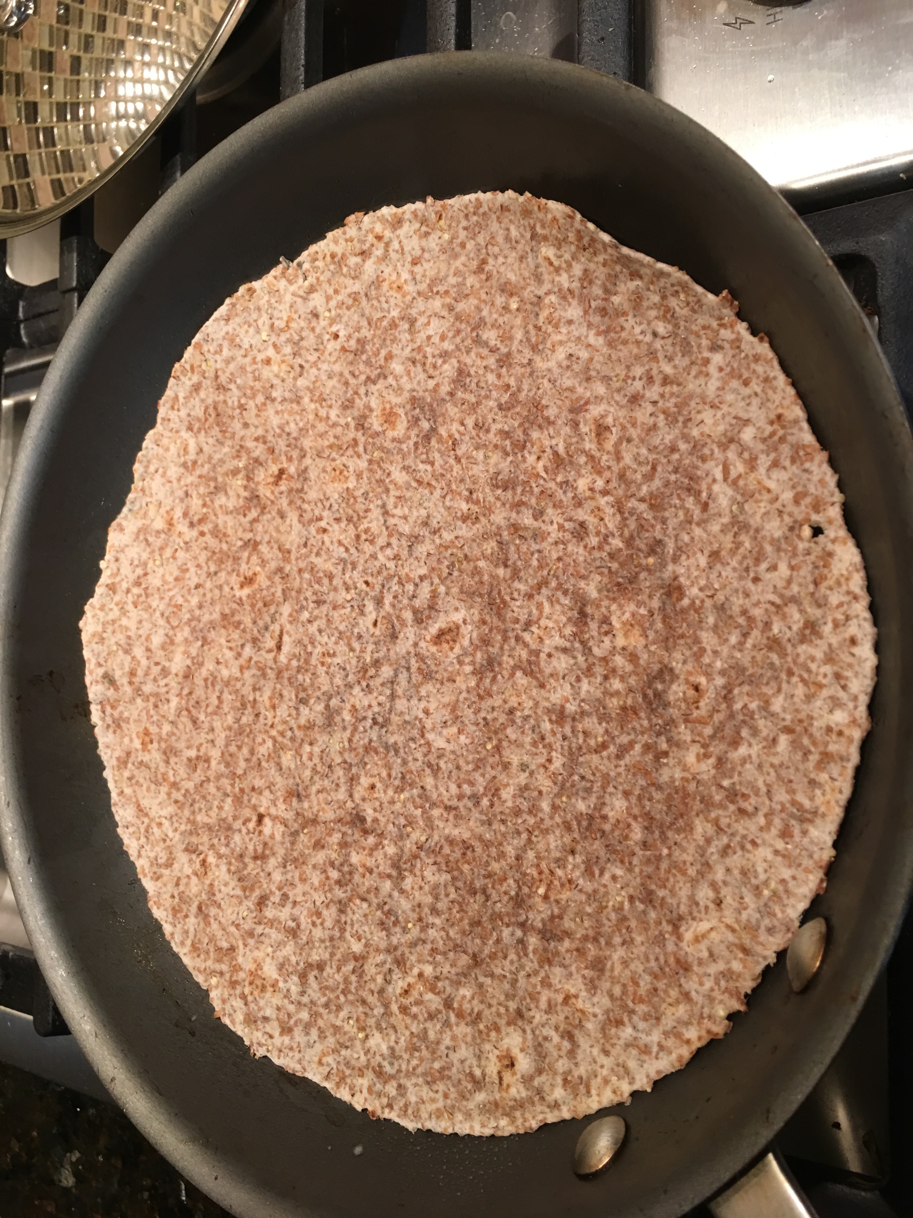 Place a large non-stick pan or griddle on medium heat on the stove. Spray the griddle lightly with grapeseed or canola oil. Place the large tortilla in the pan.