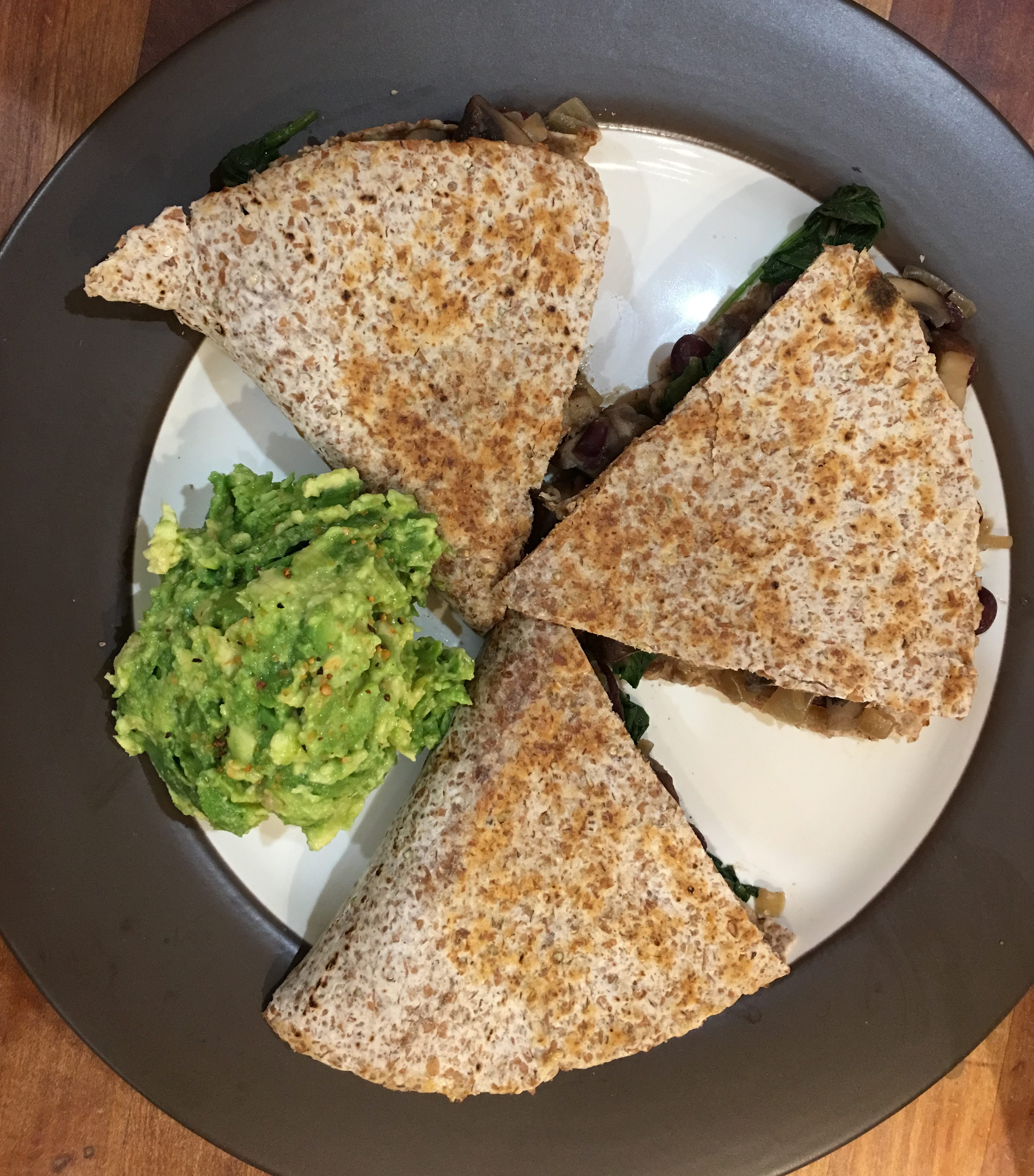 Using a spatula, place the cooked quesadilla on a plate. Cut into thirds using scissors or a sharp knife. If some filling falls out, don’t worry about it. Use a fork to scoop up any filling on the plate. Serve with guacamole.