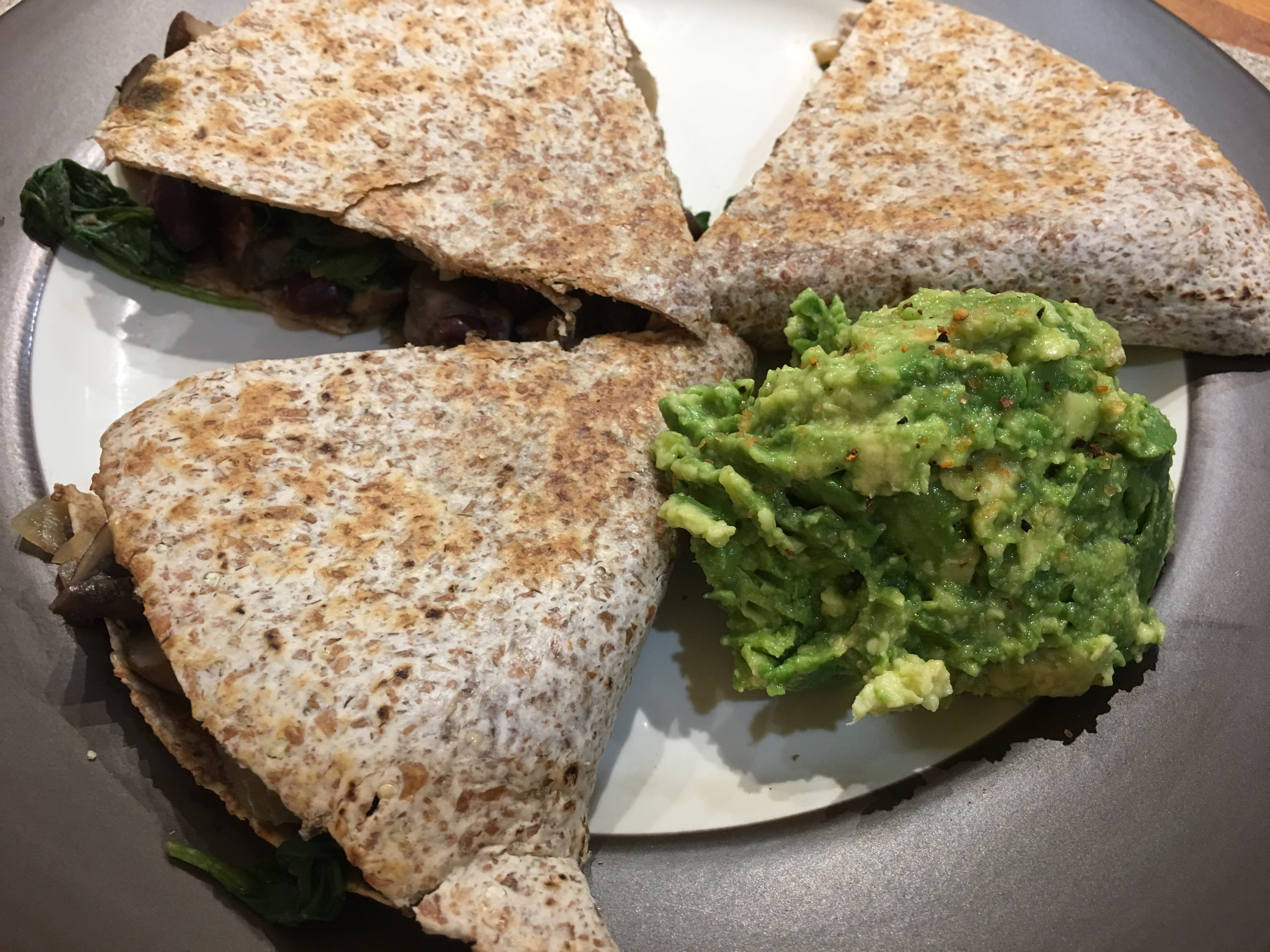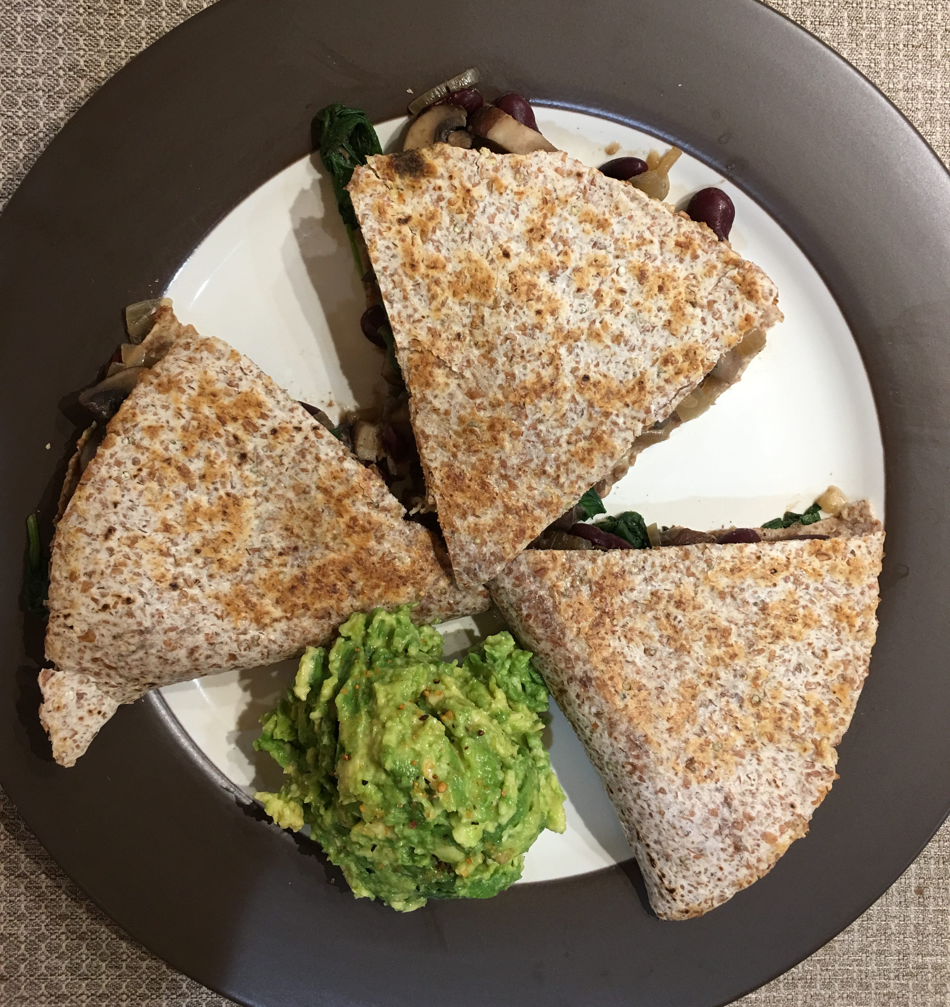 Chili is traditionally a meaty bean-based chowder but mushrooms proved to be a hearty substitute giving my quesadilla filling a more robust earthy flavor when combined with onions, kidney beans and chili powder. Although kale is not a typical ingredient in a chili type filing, adding greens to a main course dish provides more nutrients, fiber, and flavor. The addition of nutritional yeast provides a slight cheesey-like flavor to the quesadillas so you won’t miss the cheese.