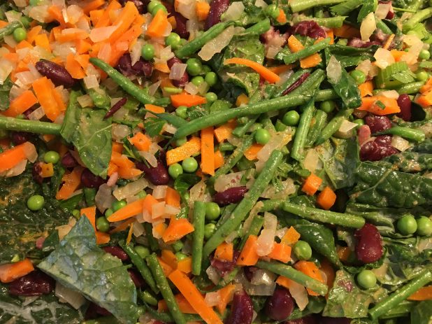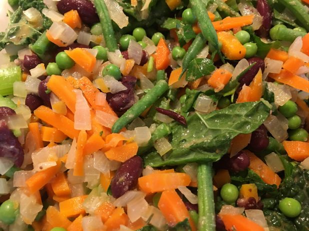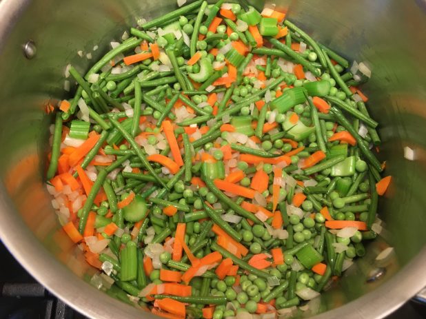 - My version below contains onions, carrots, celery, green beans, peas, and kale but you can use any vegetables you want. Simply substitute a similar amount and adjust cooking time (i.e. carrots and onions take longer to cook than broccoli). Whatever you decide, its best to do all the vegetable prep (i.e. chopping and cutting) before starting the recipe.