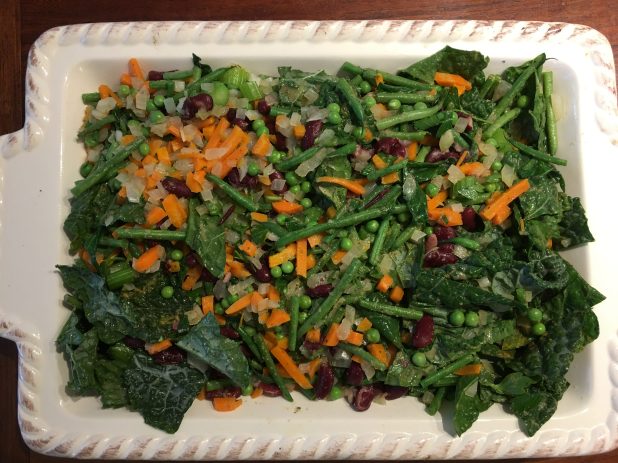 Add the rest of the vegetable broth (that was mixed with oat flour). Add the green beans and cook for 2 more minutes. Add the English peas and kale leaves and cook for 1 minute. Turn the heat off.