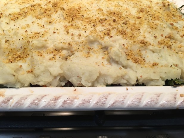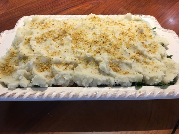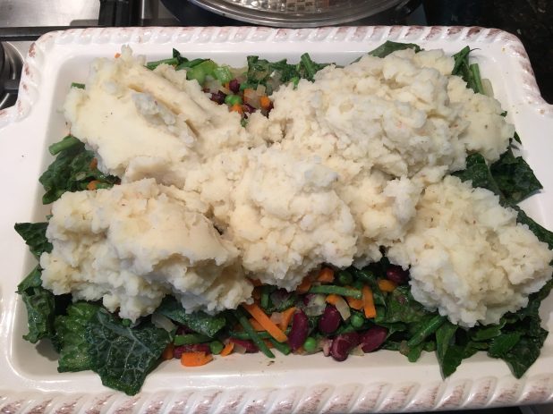 Placed big spoonfuls of the mashed potatoes all over the top of the vegetables and then gently spread the mashed potatoes to the edges of the dish.