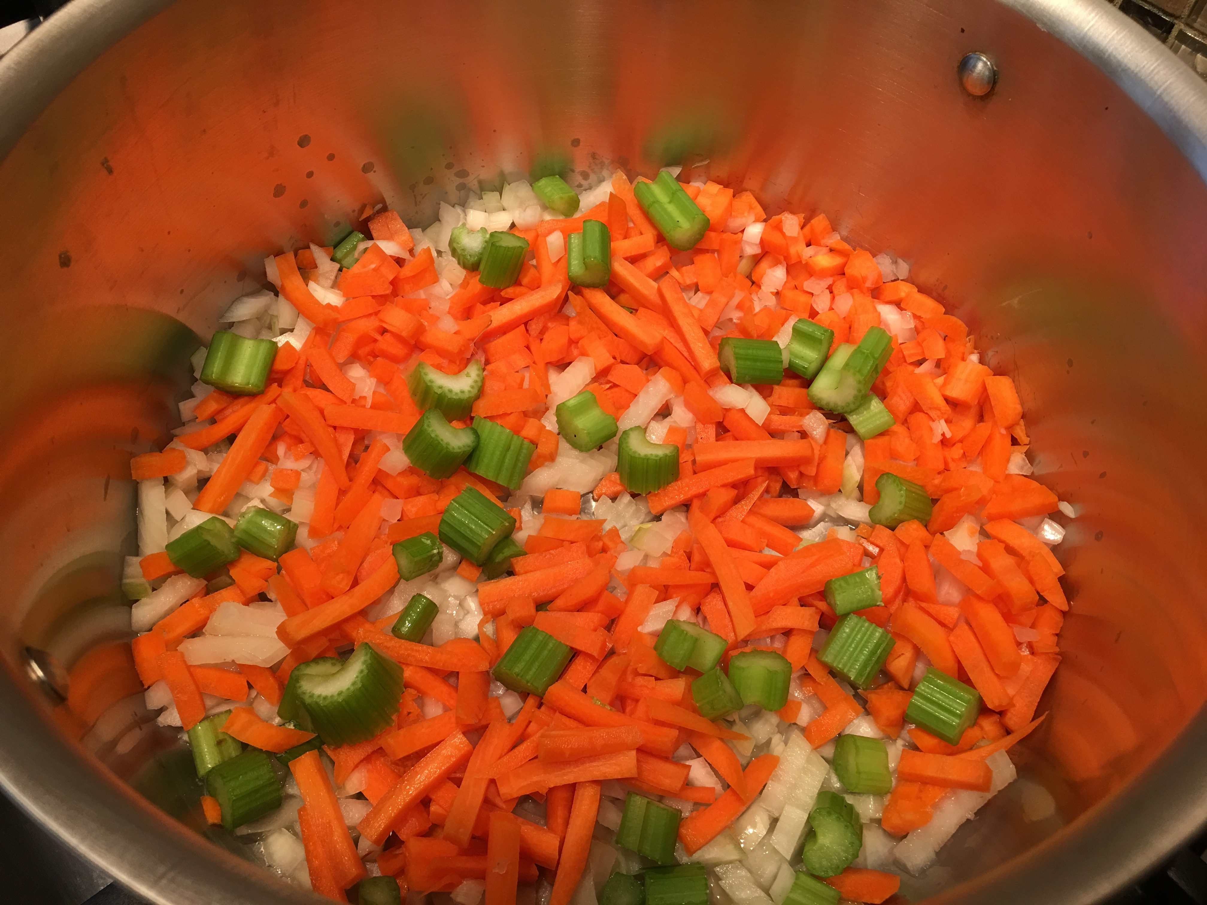 While the potatoes are cooking, place the chopped onions, carrots and celery in a big soup pot with 1/4 cup of the vegetable broth. Turn the heat on medium and cook for 7-8 minutes until the onions are translucent.