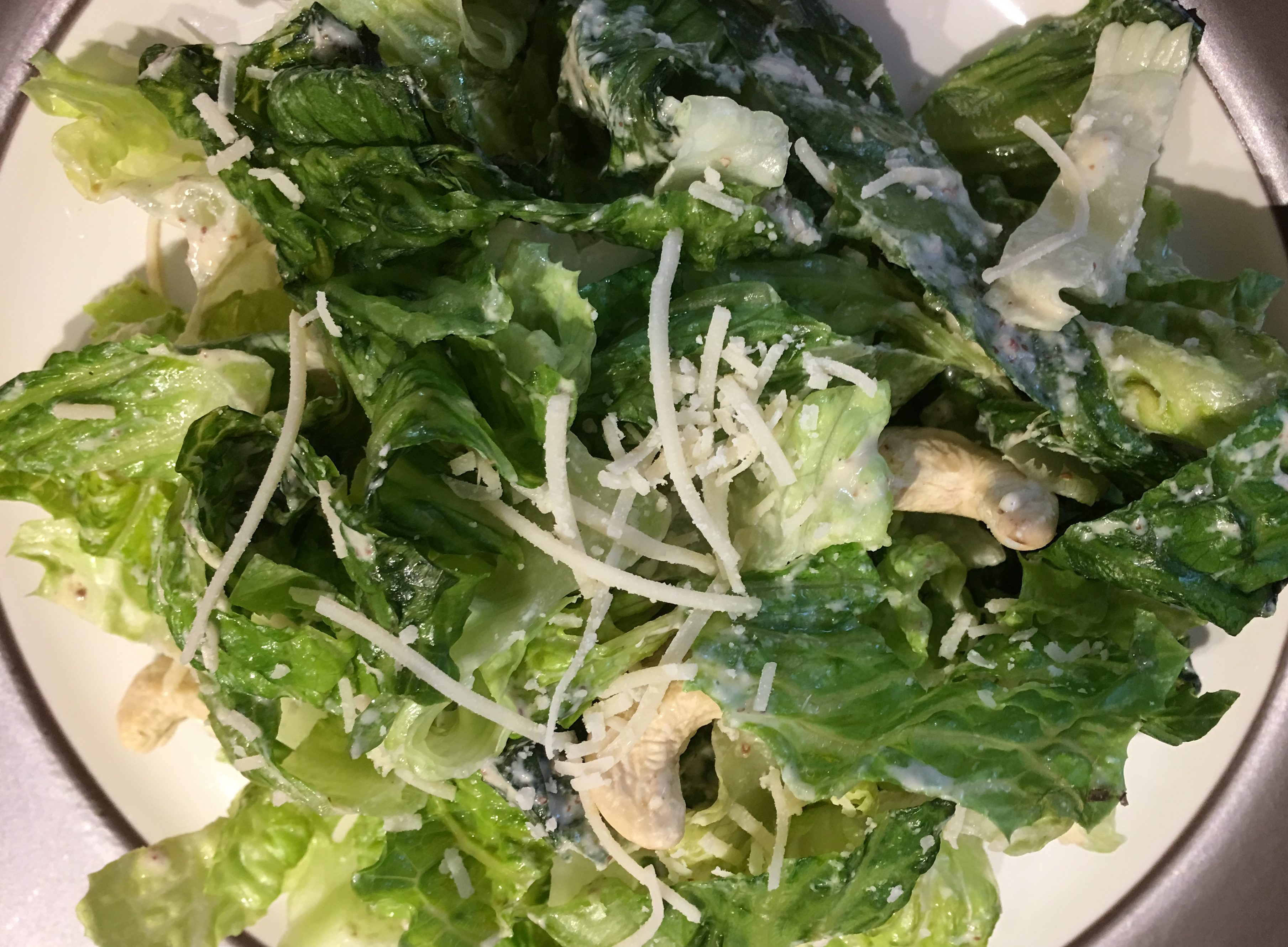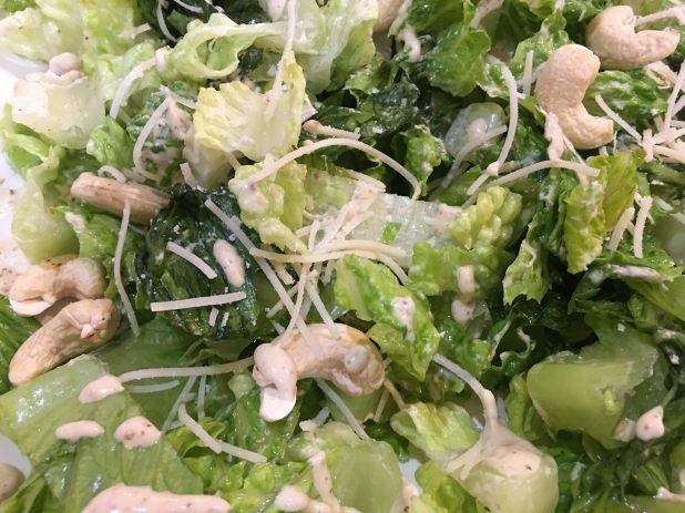 Drizzle the dressing over the salad. Toss. Sprinkle a few tablespoons of “parmesan” on the salad along with the cashews. Serve immediately.