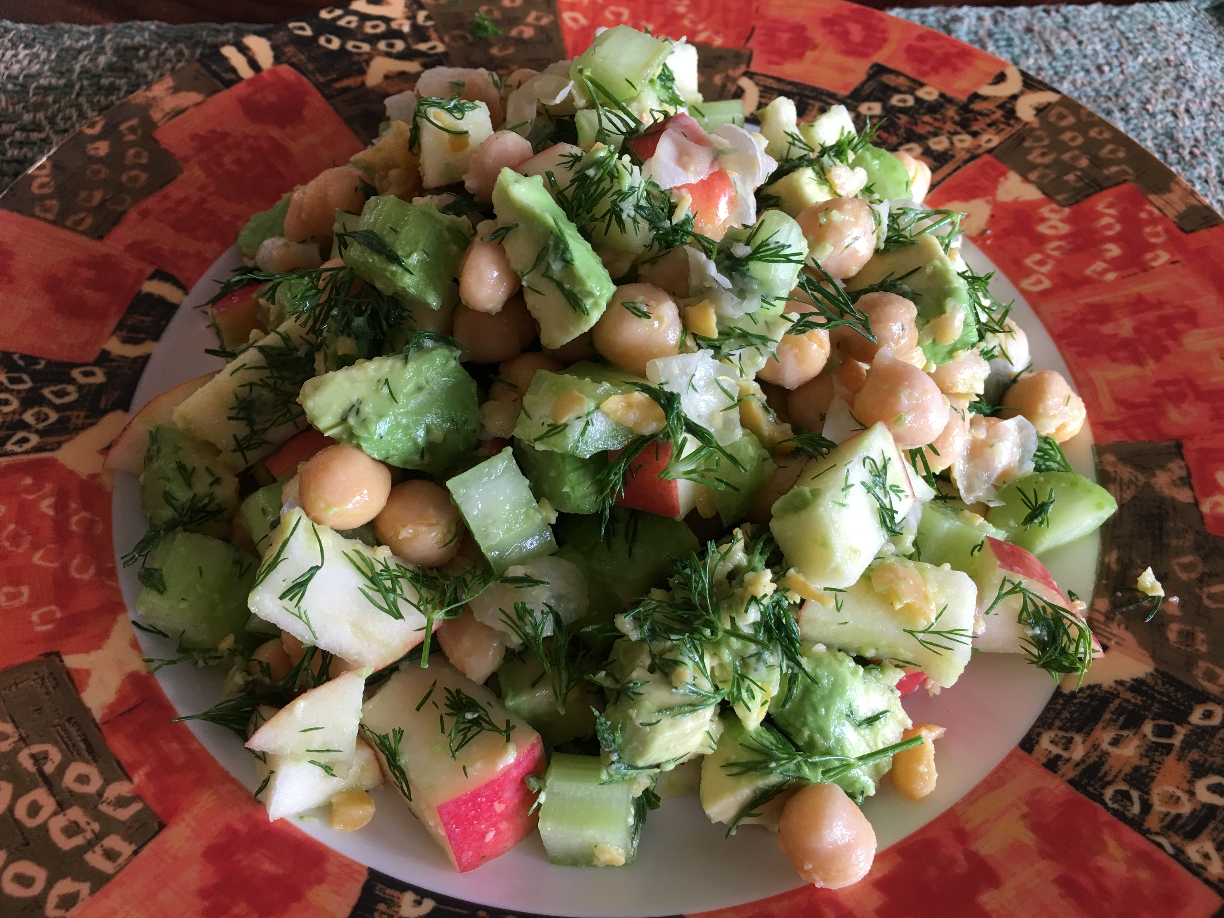 The Double A BCD Salad is a crunchy, colorful, nutritious and delicious salad that takes about 10 minutes to make. Made with 5 primary ingredients: apple, avocado, beans, celery, and dill, the Double A BCD Salad is full of nutrients, fiber, and flavor. So on those days when you don’t have a lot of time for food prep, consider making this amazing salad for lunch or supper. For an added boost of nutrition, serve the salad on a bed of greens.
