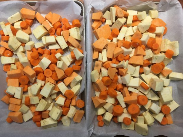 Blend the sweet potatoes and carrots and then divide among the two cookie sheets.