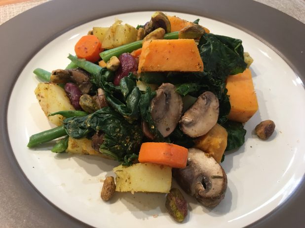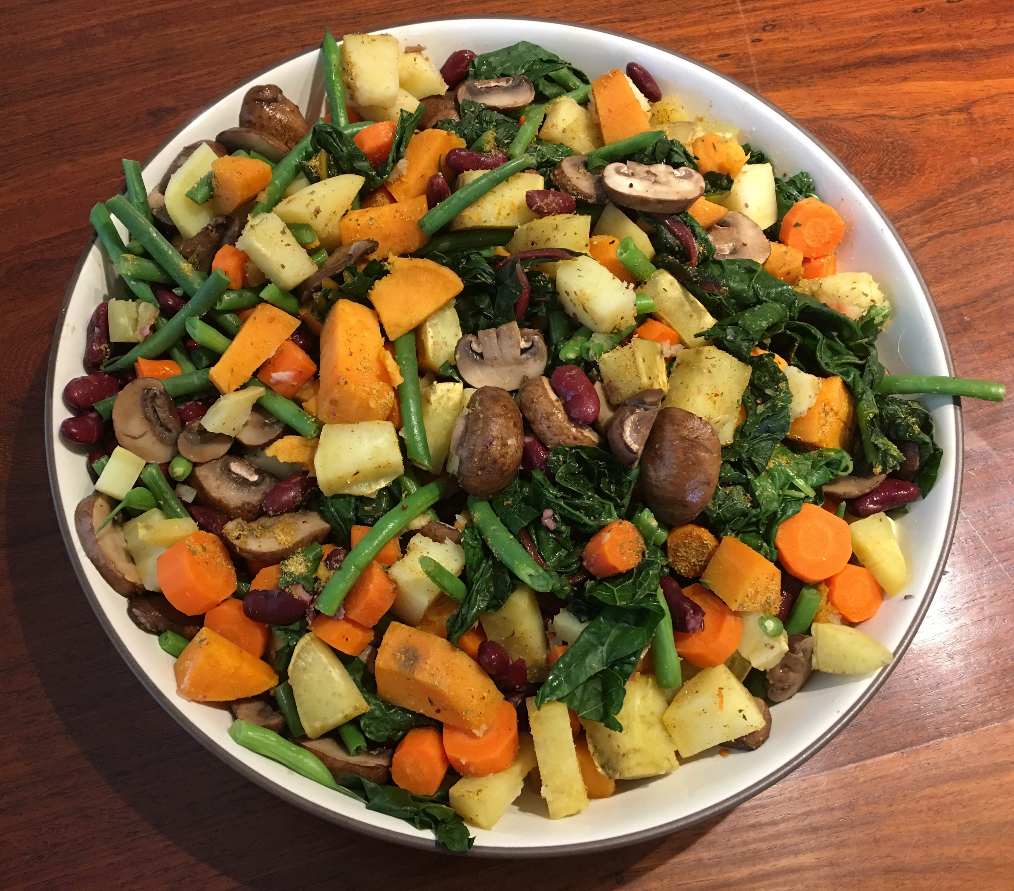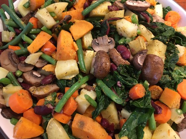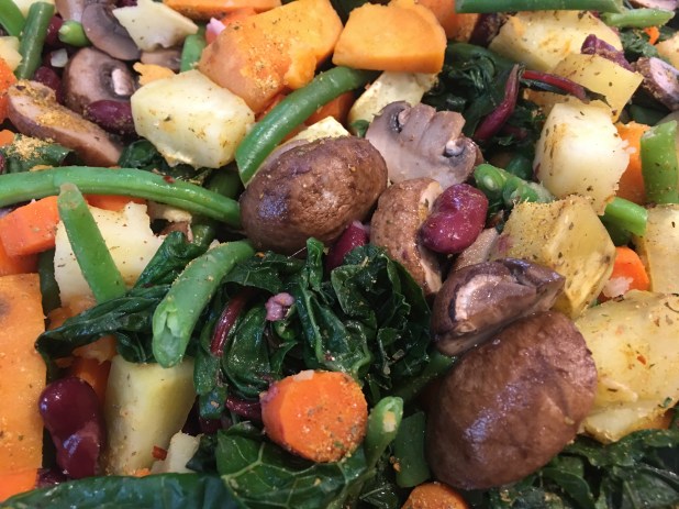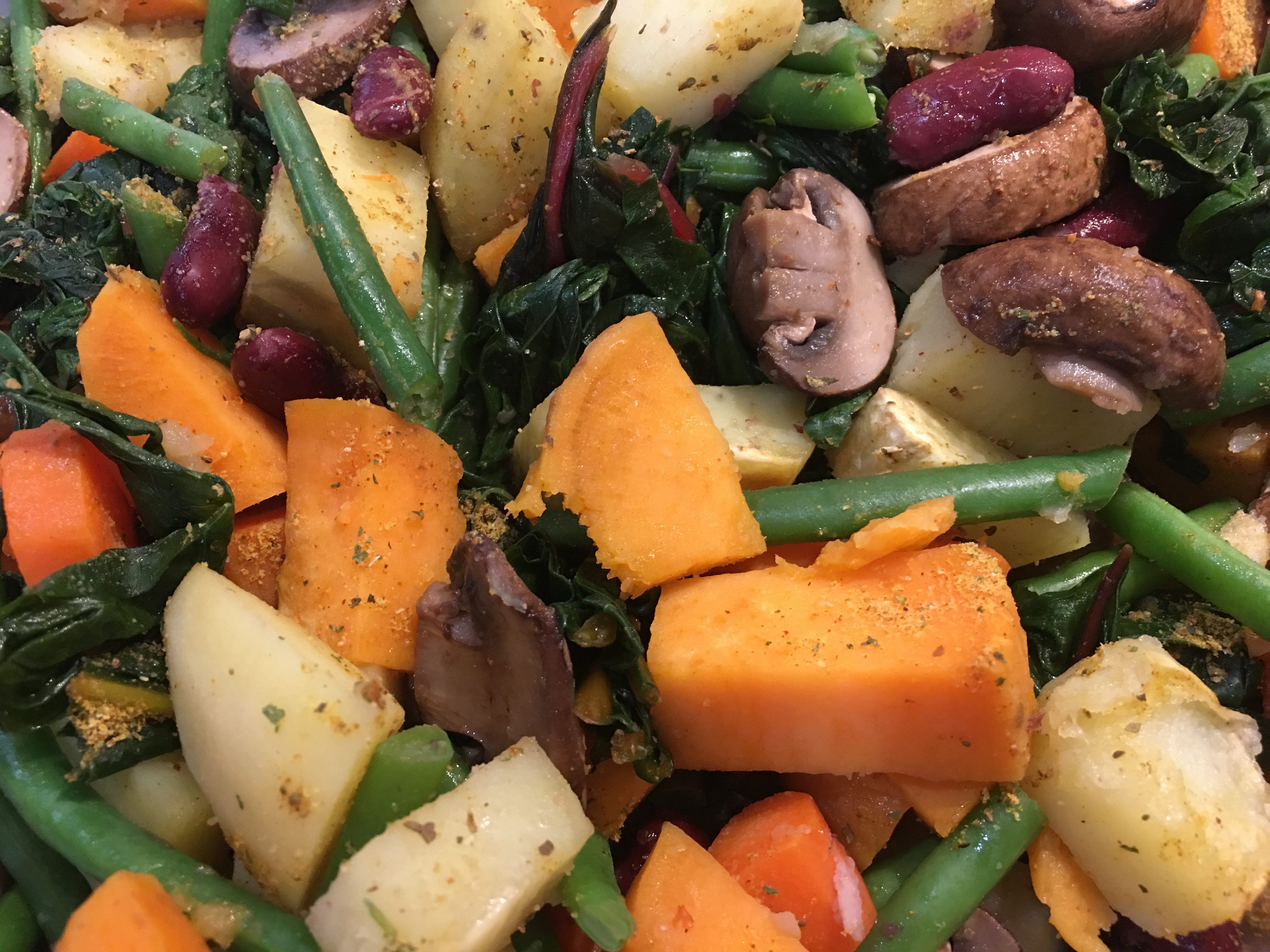 In a large bowl, gently place the finished sweet potato and carrot mixture, the mushrooms, and kale, the green beans, and the red kidney beans. Sprinkle with a teaspoon of seasoning and gently stir. Sprinkle with another teaspoon of seasoning and a bit of salt and pepper. Taste the vegetables and add an additional teaspoon of seasoning and/or salt and pepper if needed.