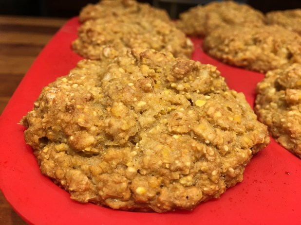 Making a moist and flavorful corn muffin without butter, oil, milk, refined sugar, or eggs used to be a challenge until I was inspired by a recipe for Double Corn Muffins in the Forks Over Knives Flavor cookbook by Darshana Thacker. Her recipe is excellent but I want a lighter muffin so I use whole grain spelt flour or Hayden Flour Mills all purpose flour (instead of whole wheat flour which is a heavier flour), medium grain cornmeal (instead of coarse) and add a teaspoon of baking soda and a teaspoon of apple cider vinegar to help leaven the muffins more than by using baking powder alone.