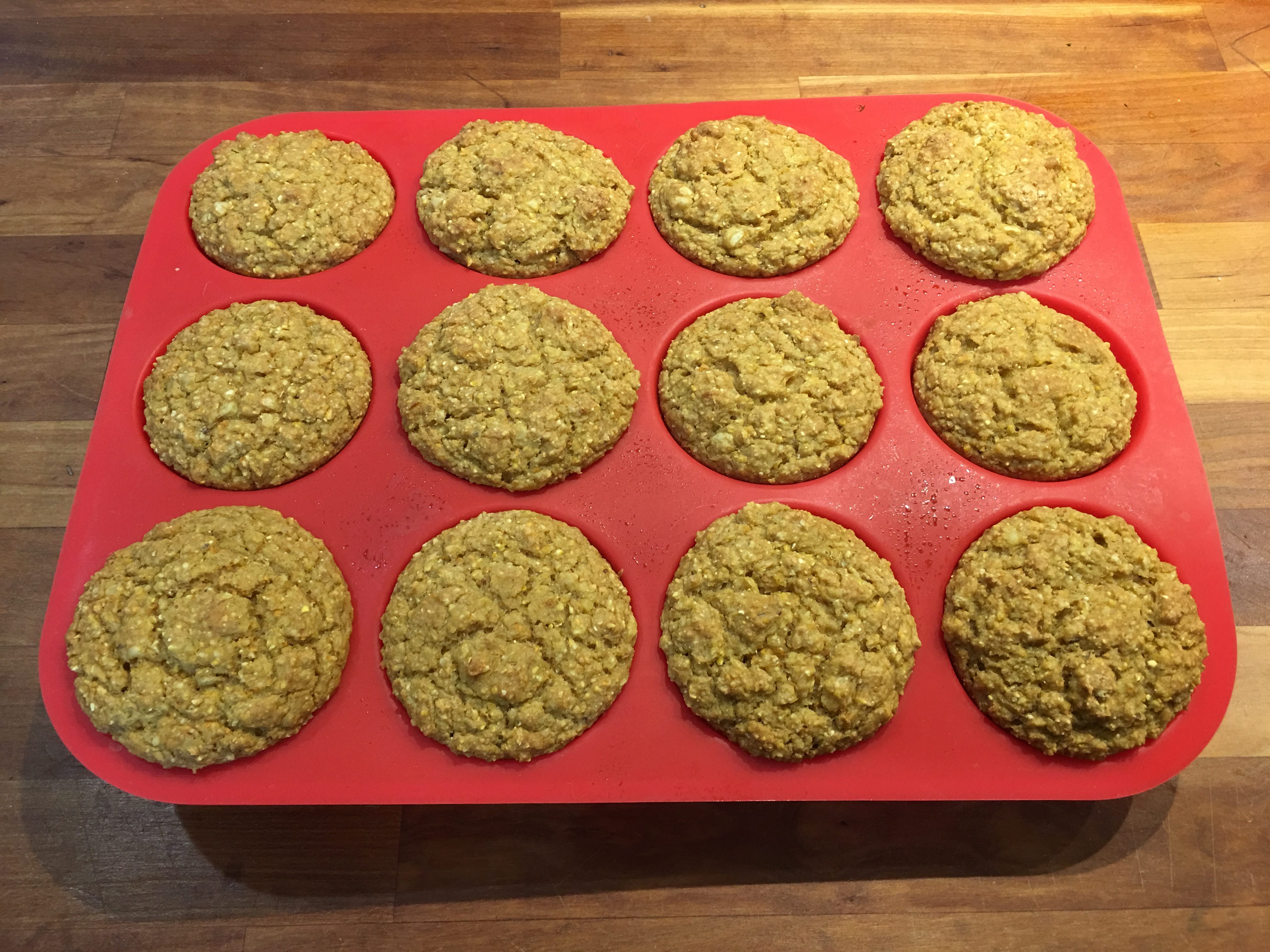 Making a moist and flavorful corn muffin without butter, oil, milk, refined sugar, or eggs used to be a challenge until I was inspired by a recipe for Double Corn Muffins in the Forks Over Knives Flavor cookbook by Darshana Thacker. Her recipe is excellent but I want a lighter muffin so I use whole grain spelt flour or Hayden Flour Mills all purpose flour (instead of whole wheat flour which is a heavier flour), medium grain cornmeal (instead of coarse) and add a teaspoon of baking soda and a teaspoon of apple cider vinegar to help leaven the muffins more than by using baking powder alone.