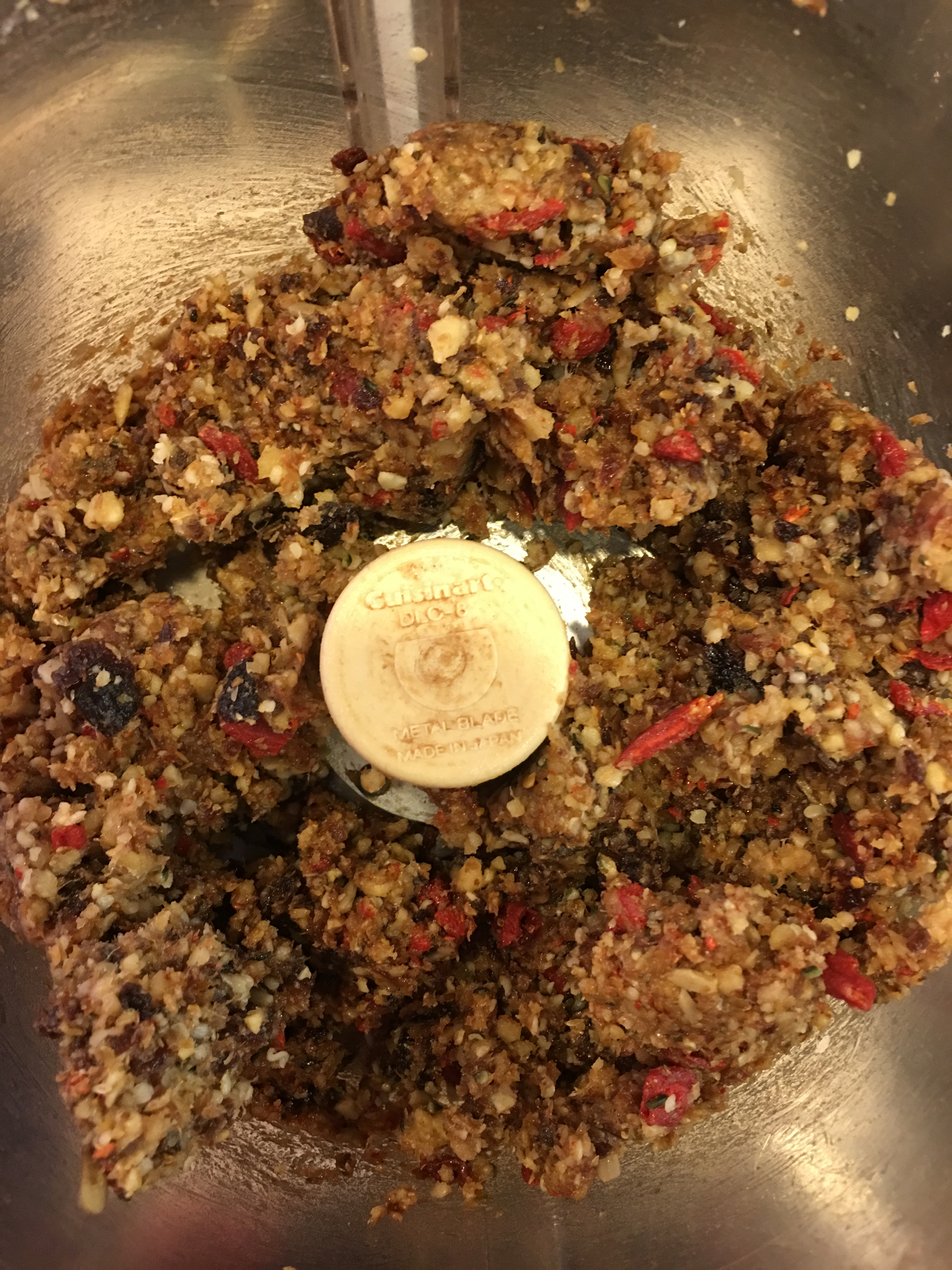 Add the sunflower seeds, goji berries, hemp hearts, flaxseed meal, and cinnamon and combine to blend (Note: you may have to stop the processor and stir). This should take about 30 seconds.