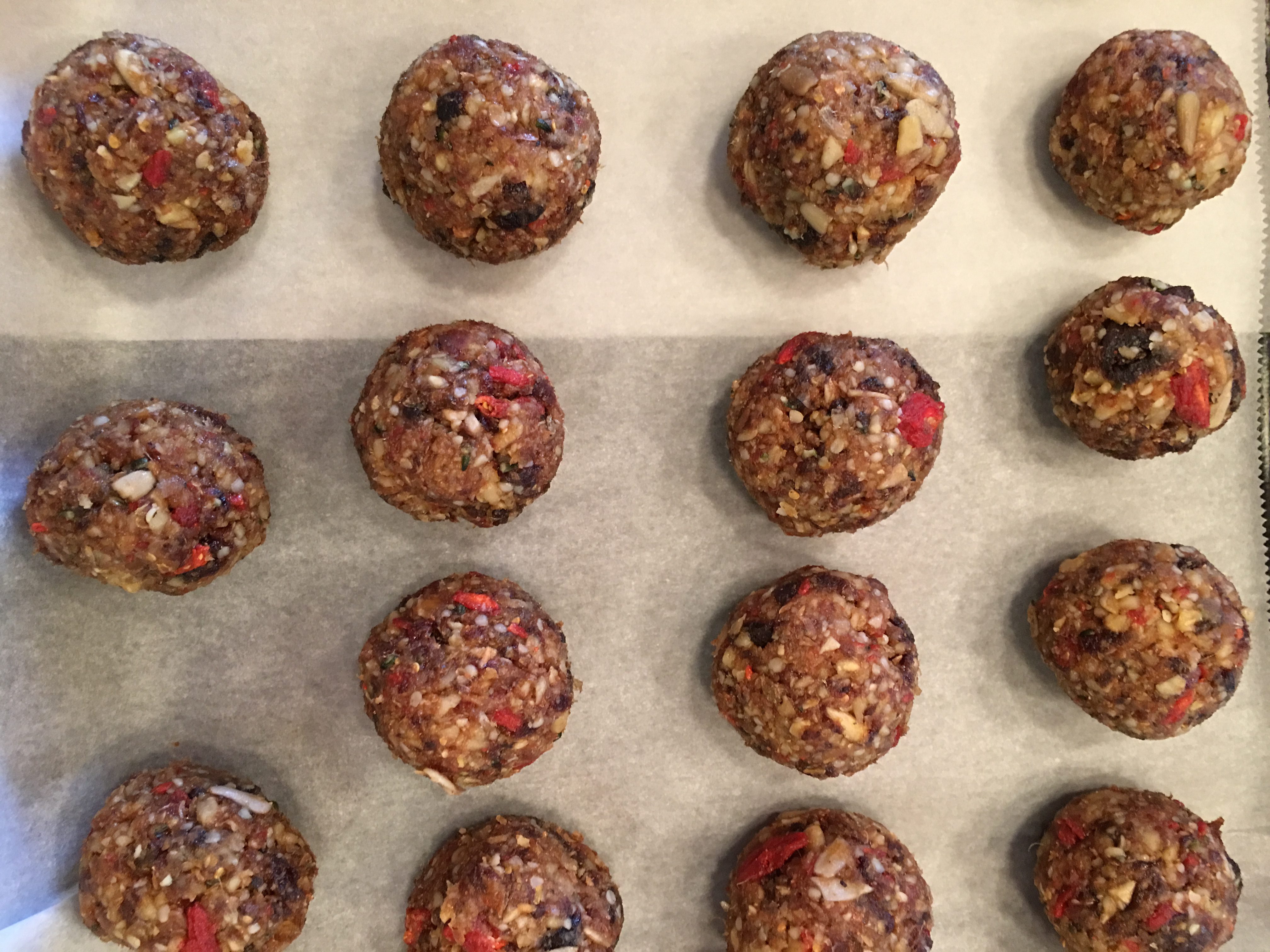 Place about a tablespoon of the mixture into your hands and roll into a ball and then place on the parchment paper. Repeat until the mixture is gone. The recipe makes approximately 20 Powerballs.