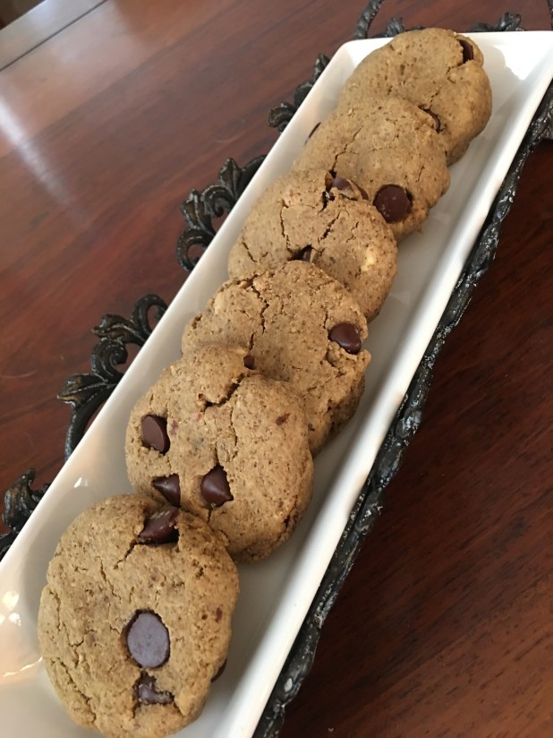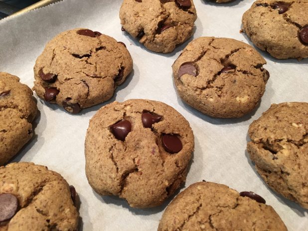 The following recipe is a variation of a recipe (“Vegan Chocolate Chip Cookies”) from Forks Over Knives. In my recipe, I reduced the amount of sugar (and used date sugar made with just dates, instead of cane sugar), added non-dairy unsweetened milk and used 85% dark chocolate chips because I prefer a less-sweet cookie and the strong flavor of dark chocolate. With no oil, no eggs, no dairy products, and no refined sugar, it’s hard to believe these cookies are thick, moist, and scrumptious, but they really are!