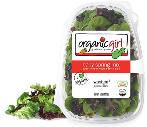 - 2 5-ounce containers (or 1 10-ounce) container of mixed baby greens (I use Organic Girl Baby Spring Mix – a blend of 14 greens: green romaine, red romaine, tango, spinach, green oak leaf, red oak leaf, red chard , green chard, lolla rosa, arugula, mizuna, tatsoi, greenleaf and redleaf.