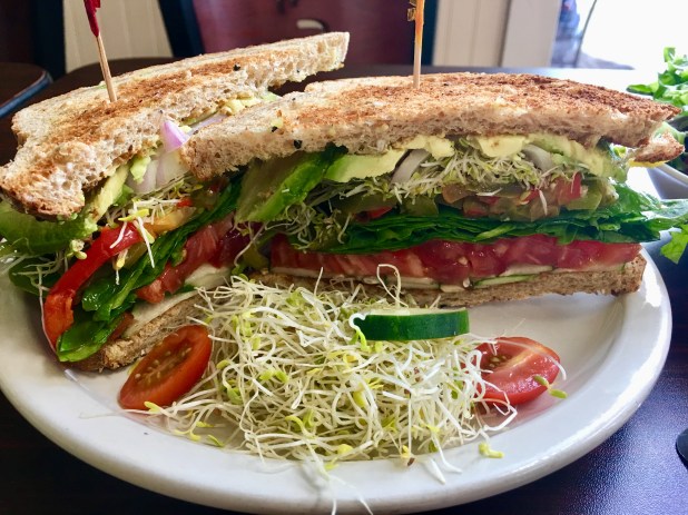 - Notable: The California Veggie Sandwich made with fresh avocado, cucumber, red onions, fresh spinach, alfalfa sprouts, fresh tomatoes, and pepper on sprouted multigrain bread (ask them to hold the goat cheese and no mayo). The California comes with a side of salad (served in a separate bowl), french fries, or sweet potato fries.