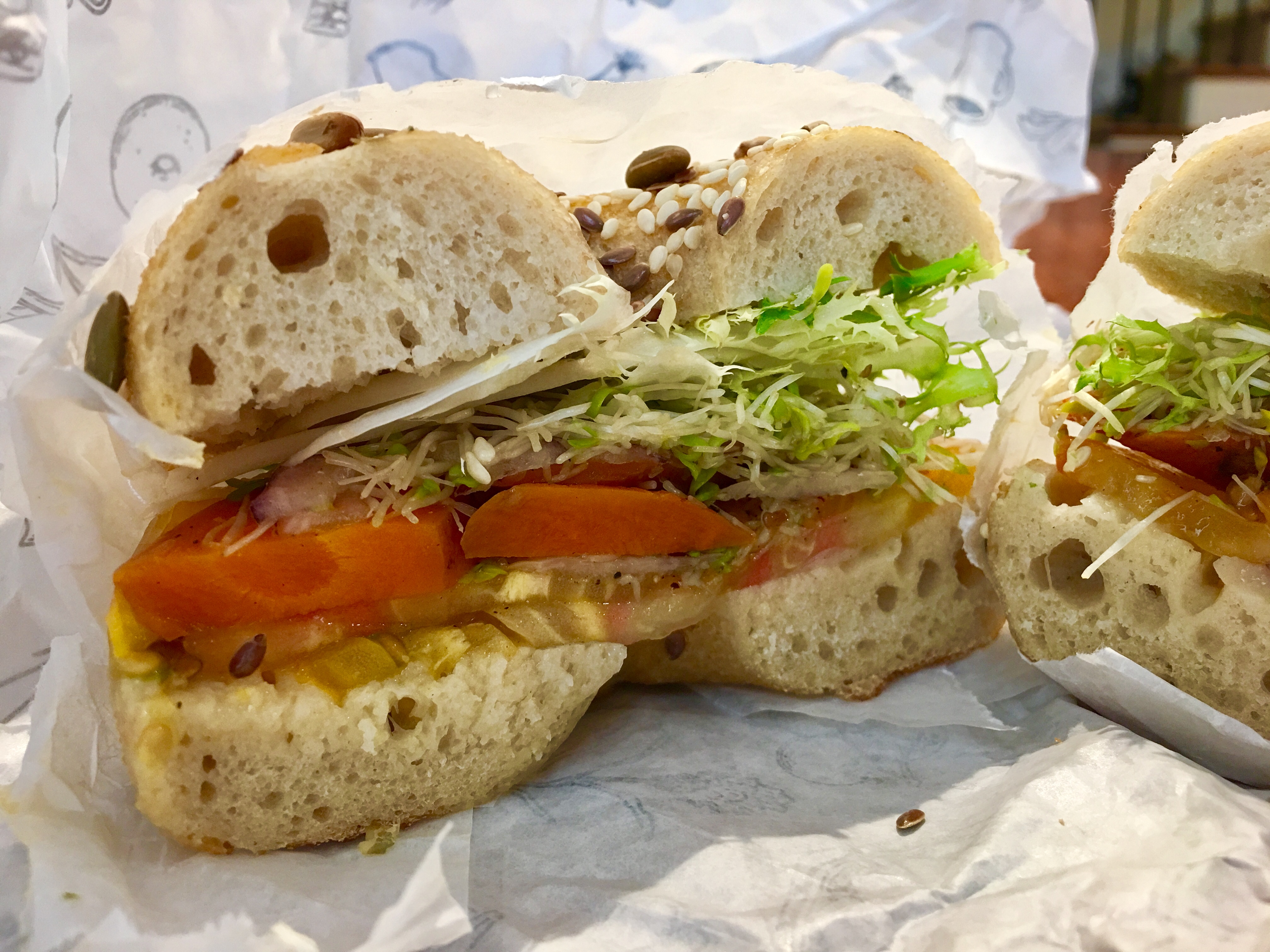 - Notable: Bagel Sandwiches (although there are no vegan bagel sandwiches on the menu, ask for the Veggie (mixed vegetables (roasted carrots, onions, tomatoes, red onion or pickled red onion, lettuce, and sprouts) without the cheese (vinaigrette is also optional). If you’ve never tasted a roasted carrot on a bagel, you’re in for a treat.