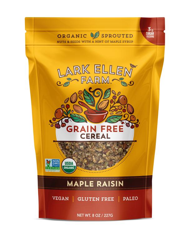 Maple Raisin Cereal: Made with a sprouted raw nut and seed mix, unsweetened coconut, raisins, cinnamon, and sea salt. 3 grams of sugar per serving.