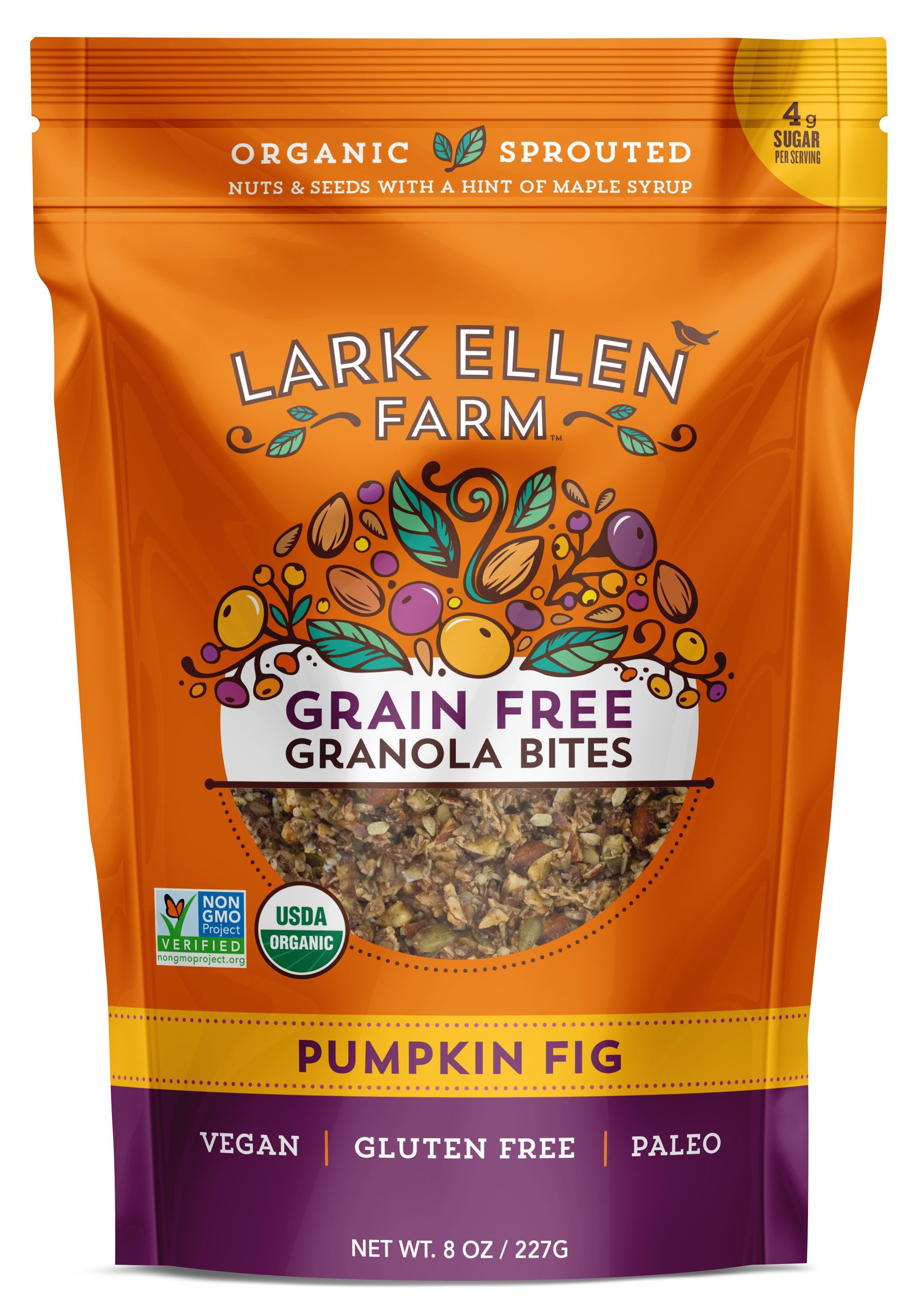 Pumpkin Fig Granola Bites: Made with a sprouted raw nut and seed mix, maple syrup, pumpkin purée, coconut, figs, vanilla extract, cinnamon, seal salt, and spice. 4 grams of sugar per serving.