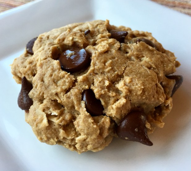 Instead of all purpose flour, I use whole grain oats, oat flour, and whole wheat pastry flour. Maple syrup is used instead of refined sugar, while 2 tablespoons of canola oil and 2 tablespoons of non-day milk replace the butter (not optimal but better than a stick of butter). For deeper flavor, cinnamon and pure vanilla extract are used. To leaven the cookie, a scant amount of baking powder, baking soda, and apple cider vinegar do the trick.