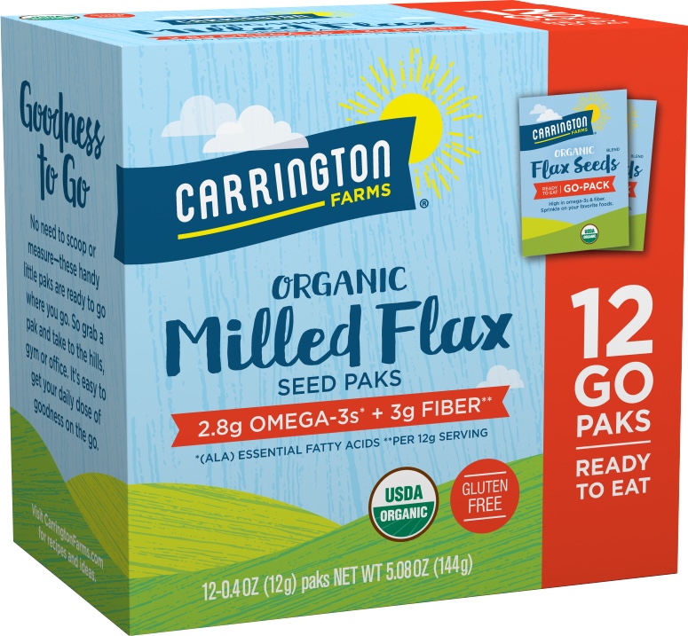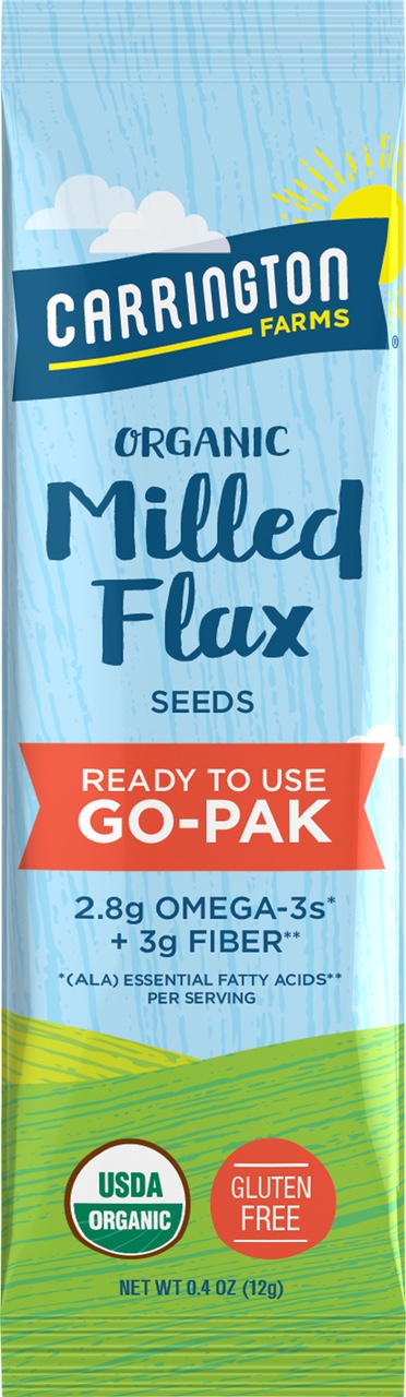 I would fill a ziplock bag with flax seed meal but after a bag burst in my suitcase, I knew I needed a better option. Enter Carrington Farms Organic Milled Flax Seed Paks: pre-measured single serve 12 gram (1 tablespoon) sealed packets that make it easy to take flax seed meal on the go.