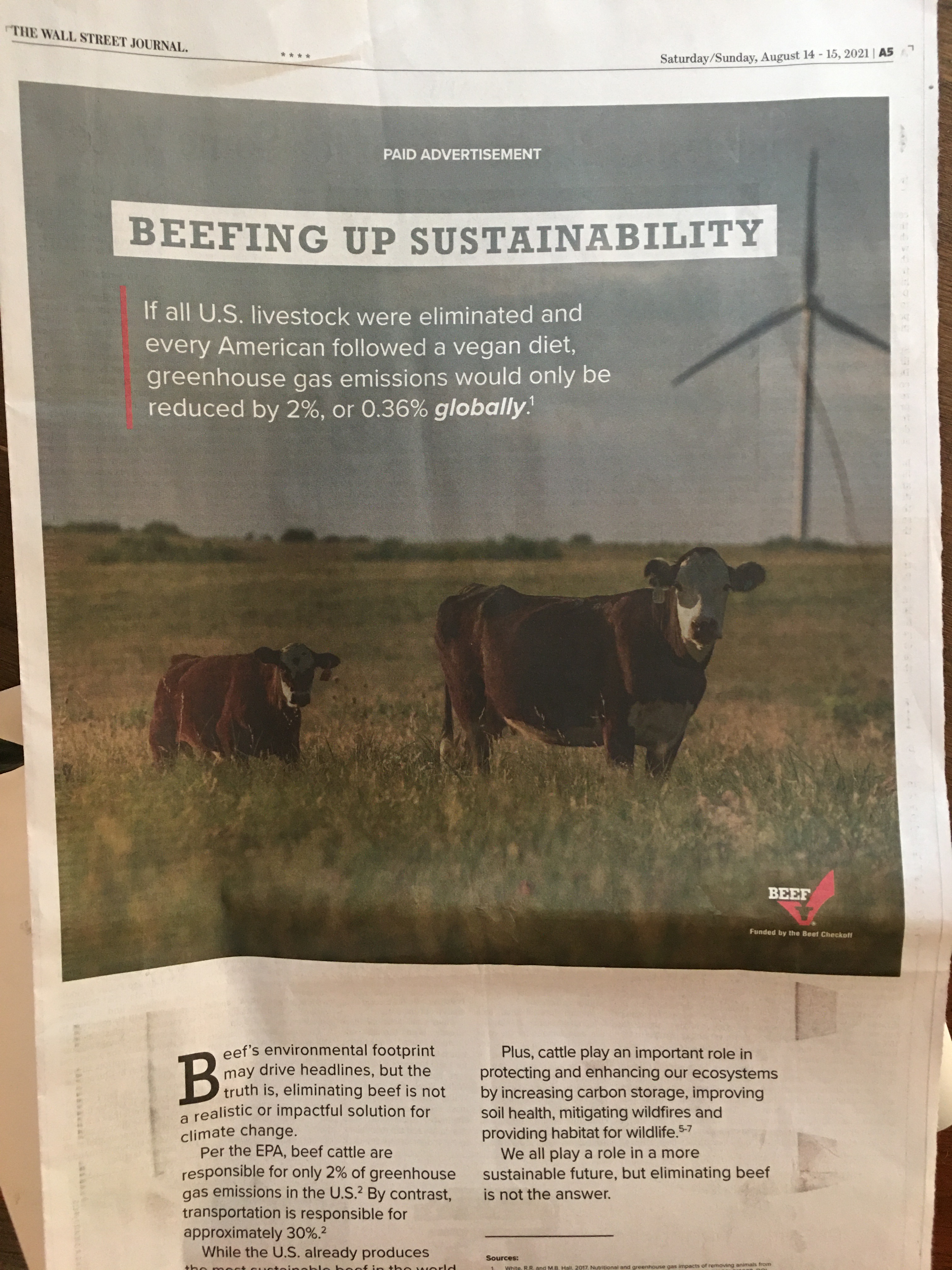 - Most of the corn and soybeans grown in the US feed livestock which greatly contributes to the environmental damage causing climate change. A few days ago (August 14, 2020), a full page ad was placed on page A5 in the Wall Street Journal that claimed “if all US livestock were eliminated and every American followed a vegan diet, greenhouse gas omissions would only be reduced by 2%, or .36% globally,” which is absolutely not true.