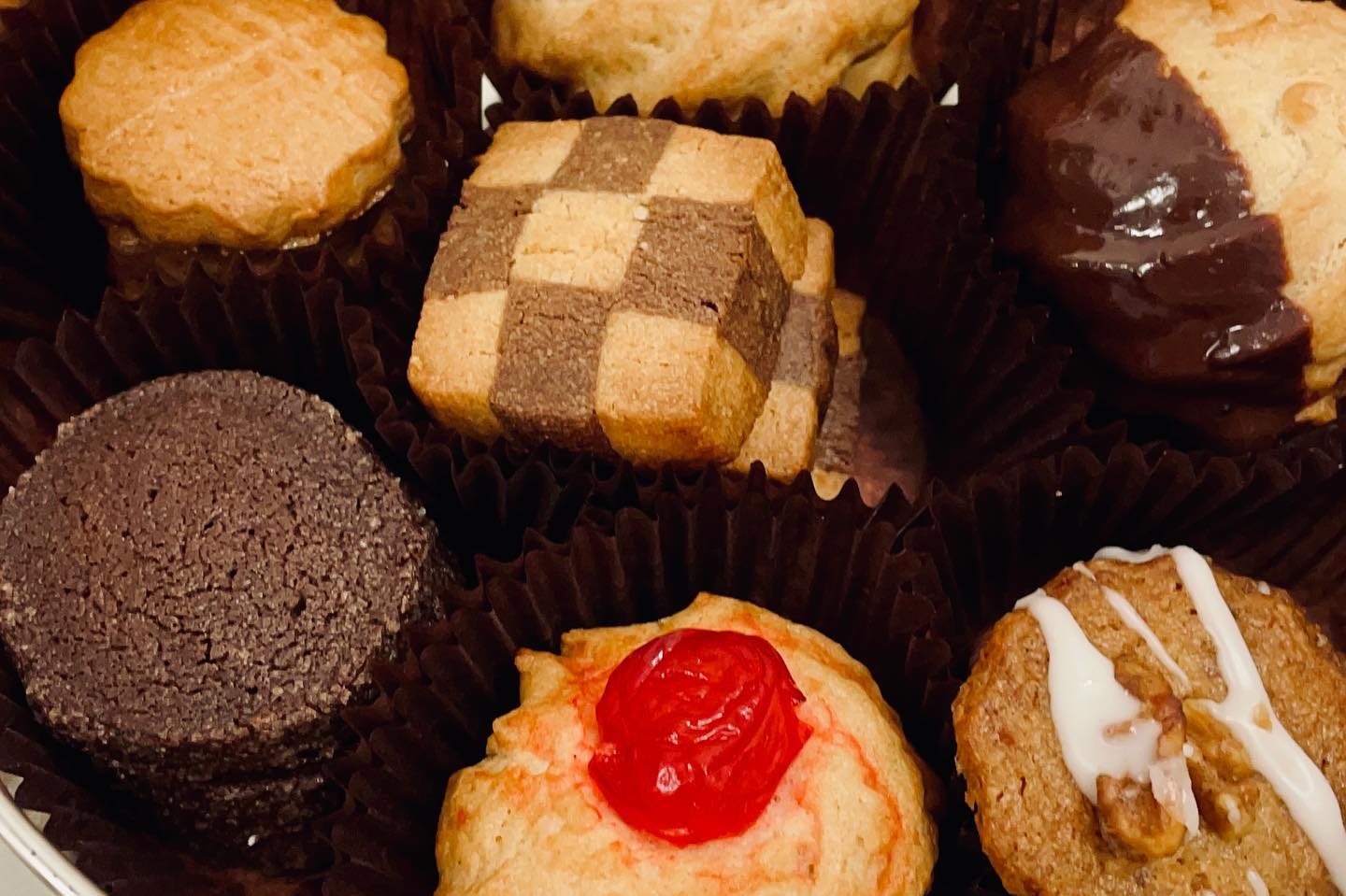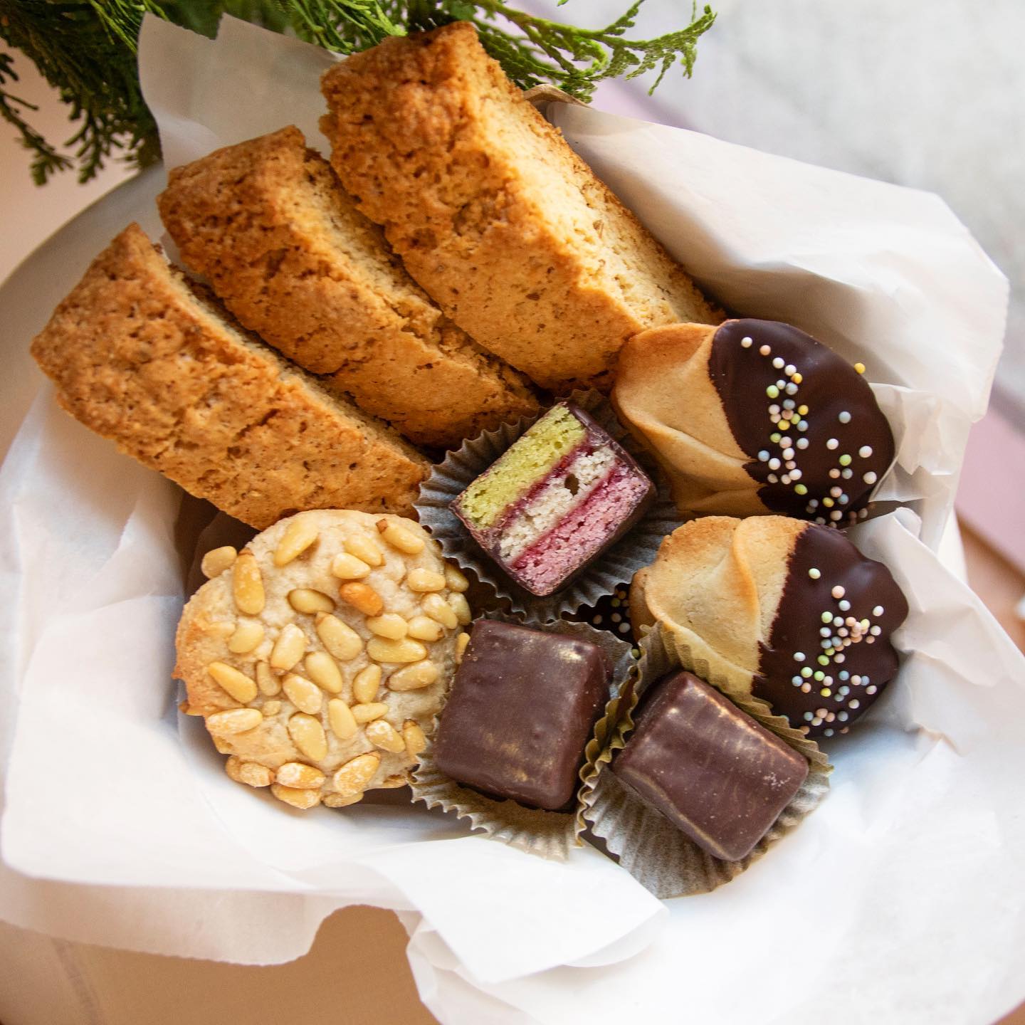The European Style Cookie Tin contains a variety of 20 cookies including Hazelnut Praline, Chocolate Diamond, Walnuts and Lemon Glaze, Vanilla with Cherry, Chocolate and Orange, and Vanilla with Strawberry Jam and Chocolate Glaze. Each tin is $30 plus shipping. Order right away. These tins sell out very quickly. www.lartisanebakeryshop.com