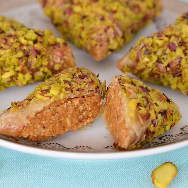 One of the most deletable treats is called the Samsa: a triangle-shaped little gem with a crispy outer layer made out of thin brik filo sheets and a moist filling made out of a mix of crunchy almonds and hazelnuts, with pistachios sprinkled on top. An 18-piece box is $35 or an 8-piece box is $19.