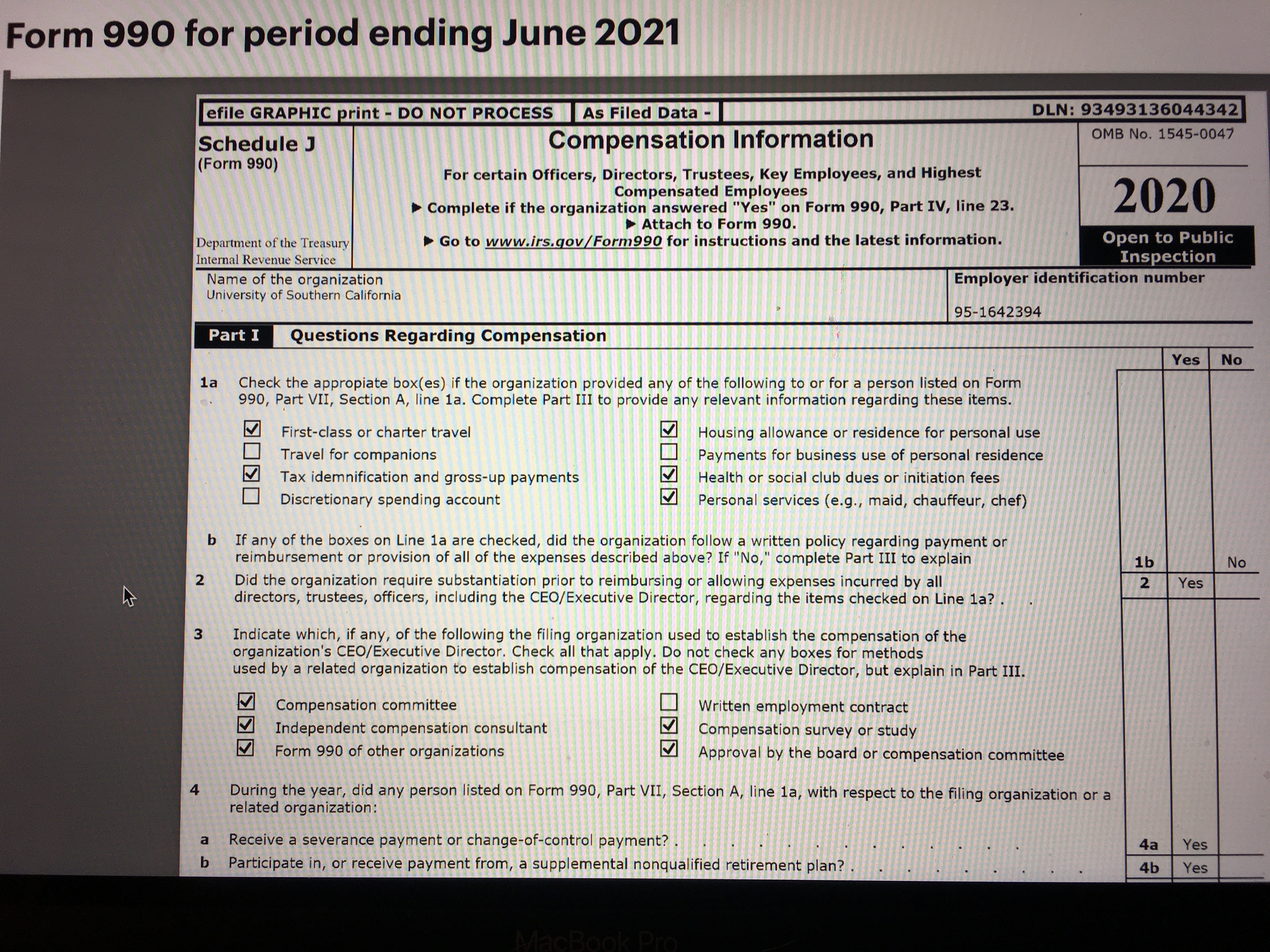 USC paid for first class or charter travel, health or social club dues or initiation fees, personal services (i.e.maid, chauffeur, chef), a housing allowance or a residence for personal use, and made gross up payments and provided tax indemnification. See Schedule J, Part III, Supplemental Information for more detail on these items and retention programs.