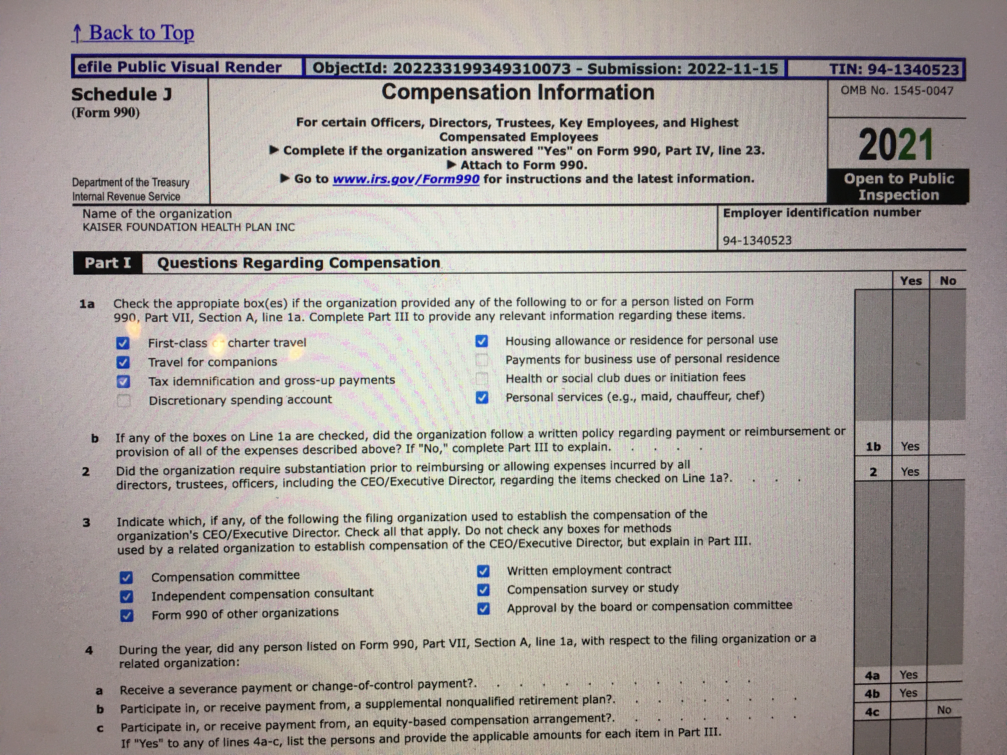 Kaiser Health is comprised of the health plan (Kaiser Foundation Health Plan, Inc), the hospitals (Kaiser Foundation Hospitals) and the medical groups (Permanente Medical Groups) although there are numerous non-profits that make up the entire organization. The focus of this post is on the executive compensation reported on the Form 990 of the Kaiser Foundation Health Plan, Inc. (KFHP) because this organization reports the compensation for the key executives including the Chairman and CEO (as opposed to a related organization reporting compensation from a related organization).