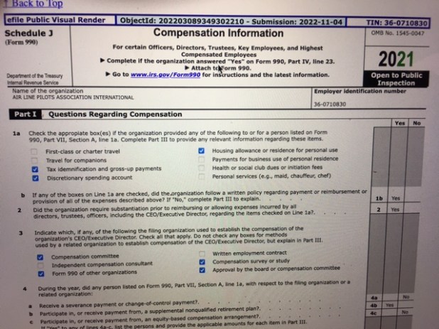 ALPA has a supplemental non qualified retirement plan. Additional taxable compensation related to a 457F non qualified deferred compensation plan was reported for Mr. Joseph DePete in the amount of $548,364 above.