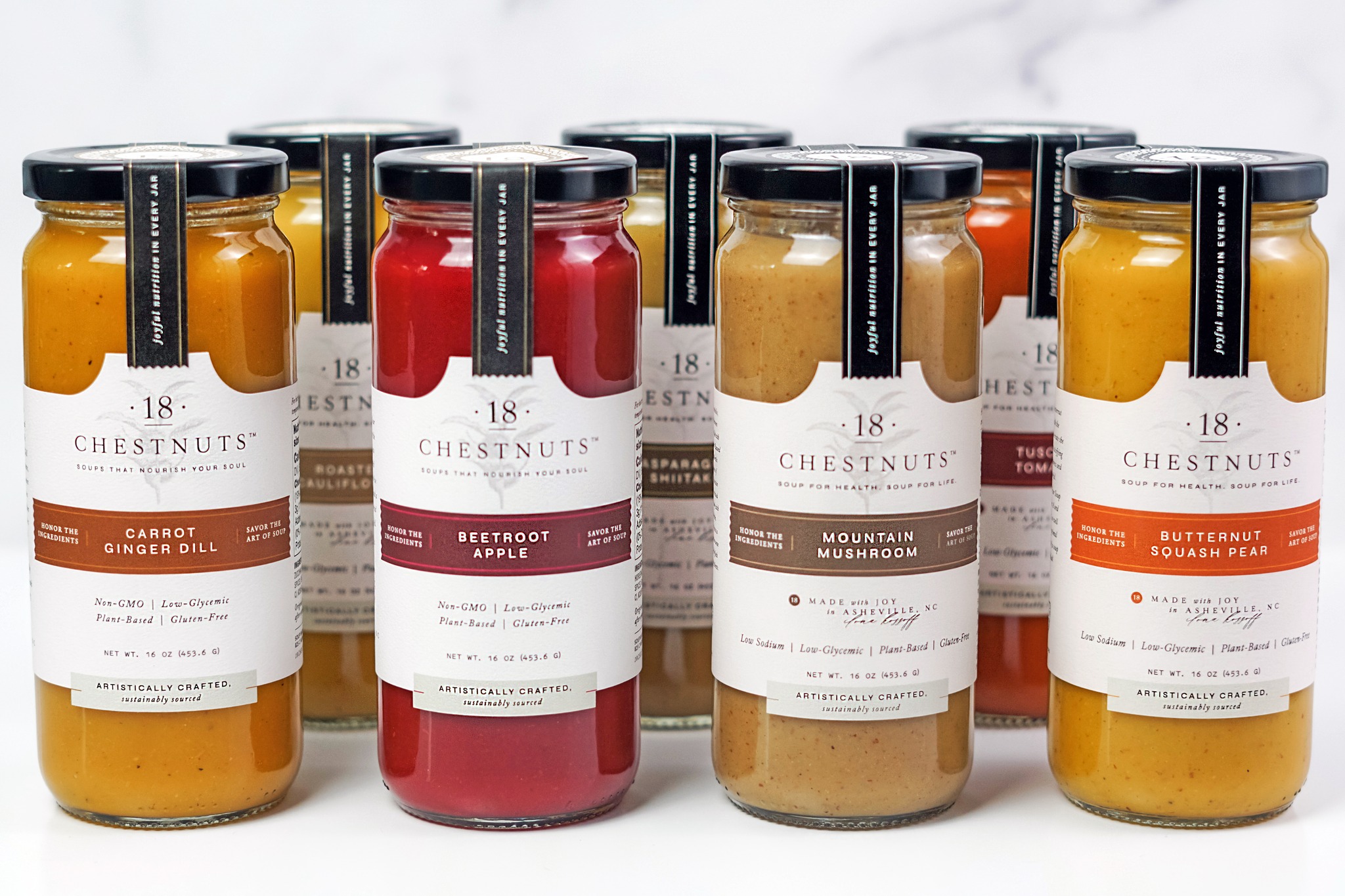 Most shelf stable soups are made with additives and way too much sodium but not soups made by Asheville, NC- based 18 Chestnuts. Try the Roasted Cauliflower (top with a few small pieces of roasted cauliflower), Tuscan Tomato (top with homemade croutons), or the Mountain Mushroom (top with sautéed mushrooms). All are dairy-free and delicious. But at www.18Chestnuts.com