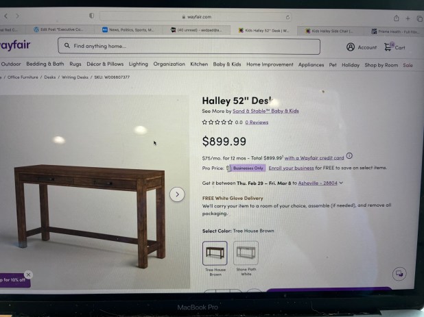 On February 2, 2023 I placed an on-line order for a desk (advertisement listed below) from Wayfair that gave me 2 choices at checkout: free UPS delivery which would require me to assemble the desk or truck delivery with “Free White Glove Delivery” where “We’ll carry your item to the room of your choice, assemble (if needed), and remove all packaging.” If I chose the UPS delivery, the desk would be delivered in about a week while the truck with white glove delivery would take an estimated 2-3 weeks. I chose the truck with white glove delivery.