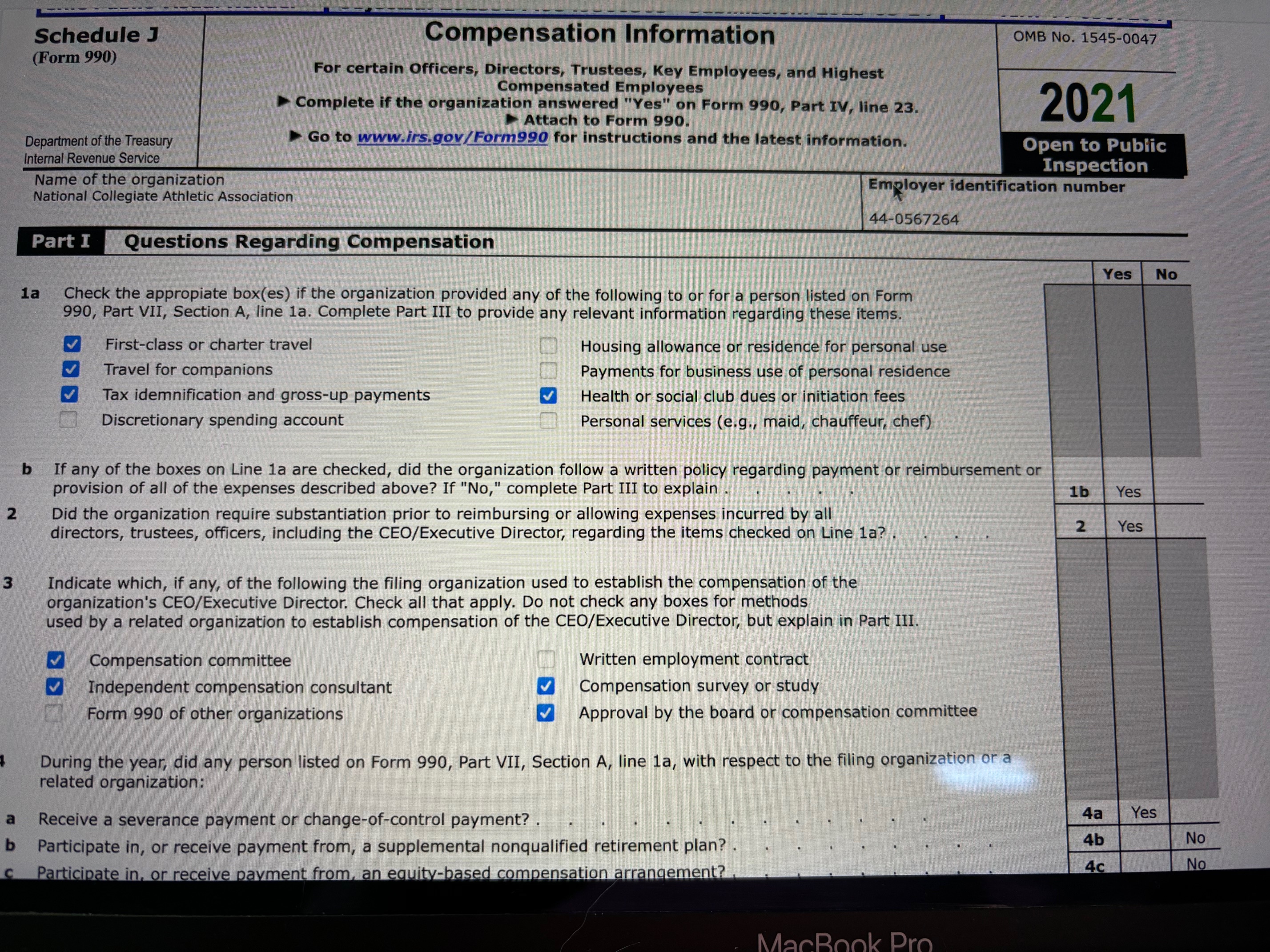The NCAA paid for first class or charter travel. Specifically, the NCAA paid for chartered business travel, when necessary due to scheduling for the President, Chief Medical Officer, COO, EVP, SVP’s (3), and VP’s (2). This was a non-taxable business expense.