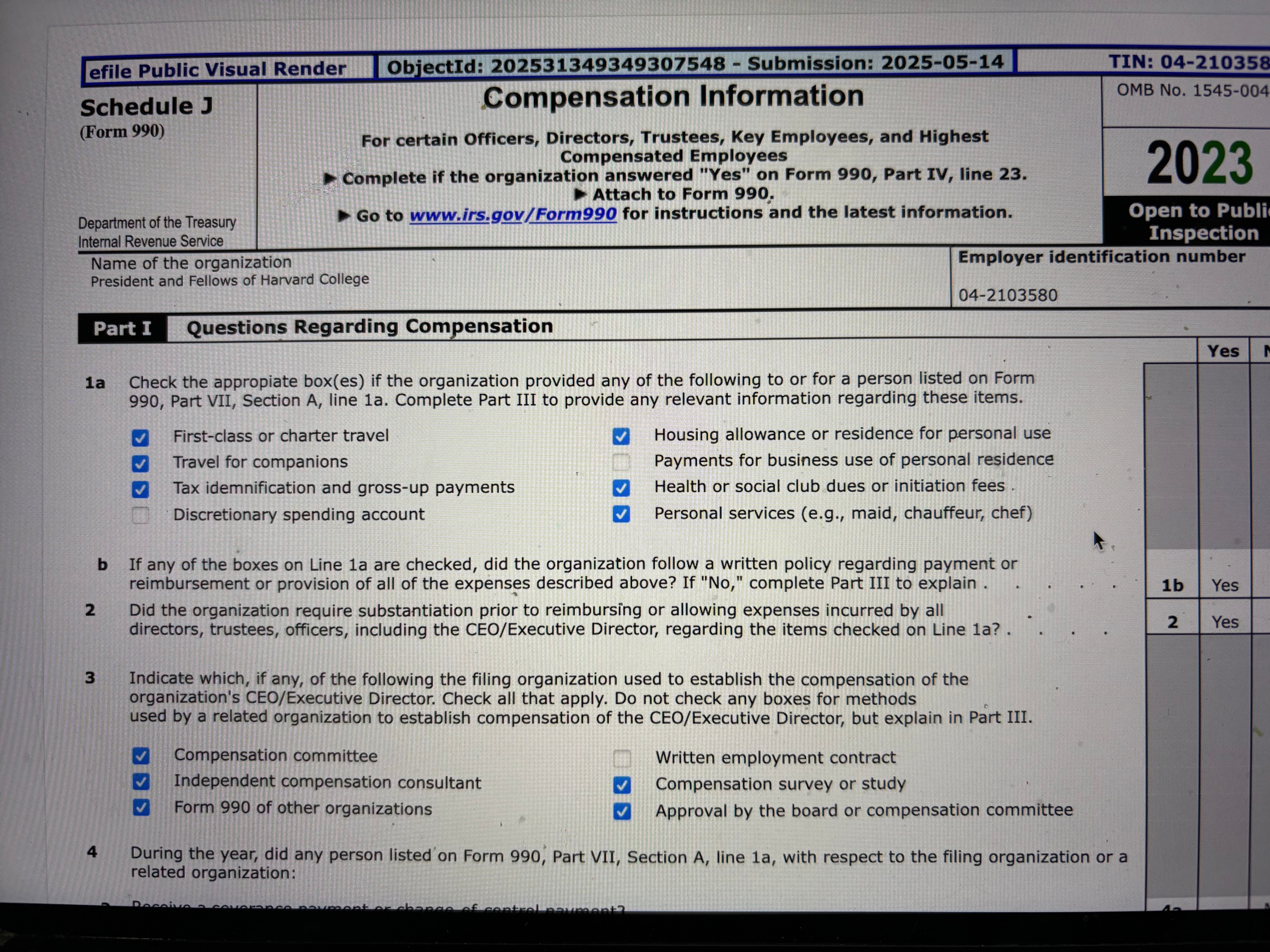 Harvard paid for first class or charter travel, travel for companions, personal services, health or social club dues or initiation fees, and provided housing or a housing allowance, gross up payments or tax indemnification. To read more detail about these expenses and the non-qualified supplemental retirement plan, see the Form 990, Schedule J, Part III, Supplemental Information.