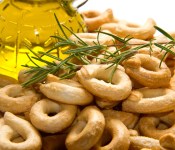 Taralli are round Italian breadsticks, similar in texture to a crumbly cracker with a savory or sweet taste, depending on the ingredients. A delicious, crunchy pretzel-like snack that can be eaten on its own, Taralli are traditionally made with flour, extra virgin olive oil, white wine, yeast, and salt although the savory Italian rings are often flavored with fennel seeds, onion, pepper, sesame seeds, oregano, tomatoes, anchovies or poppy seeds. Read more