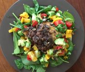 The following recipe is a variation of the Purple Carrot recipe for Mole Enfrijoladas. I eliminated the oils, jalapeño and garlic (but feel free to add these ingredients if you prefer a hotter, spicier meal) and nuts but added mango, sweet Marzano tomatoes, cilantro, pumpkin seeds, and more onion to make a super tasty enfrijolada (a tortilla drenched in pureed black beans) on a bed of spinach with an Avocado Mango Citrus Salad. Read more