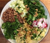The following recipe is a variation of a recipe (Millet Vegetable Fattoush) from the Purple Carrot. The low-sodium vegetable broth adds some flavor to the millet while the vegetables give the salad a delicious crunch. Beans add some depth to the salad along with the avocado and walnuts. I prefer a lemon vinaigrette sprinkled very lightly over the salad. Read more