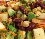 In my quest to eat at least a cup of beans a day, I created this recipe that combines beans with vegetables, fruit, and fresh dill to make a delicious bean salad, worthy of any lunch or dinner plate. Easy to make, Bean Salad takes about 15 minutes to put together and easily serves four, but you can keep it all to yourself and snack on it throughout the day.